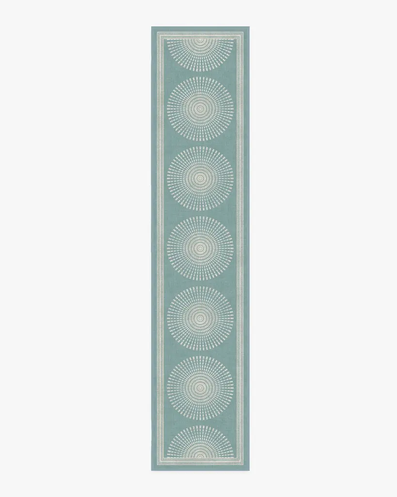 Bring home understated glamour with our Jonathan Adler Santorini Blue Rug. This geometric repetition of a radial pattern is both elegant and simple. The subtle ivory gradient seamlessly blended within each motif gives a captivating sense of depth and refinement against a sky blue background. Water-resistant, stain-resistant, and machine-washable. Rug colors may vary slightly according to your device and the lighting in your space.
