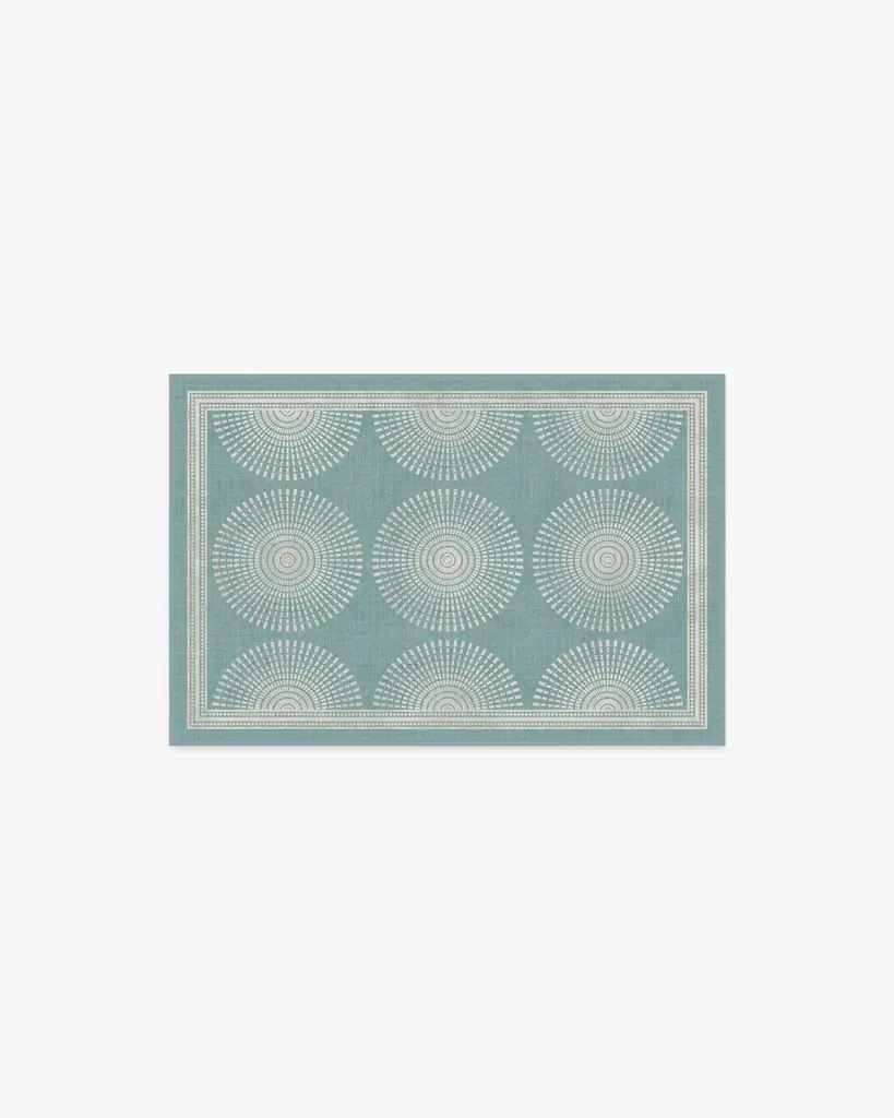 Bring home understated glamour with our Jonathan Adler Santorini Blue Rug. This geometric repetition of a radial pattern is both elegant and simple. The subtle ivory gradient seamlessly blended within each motif gives a captivating sense of depth and refinement against a sky blue background. Water-resistant, stain-resistant, and machine-washable. Rug colors may vary slightly according to your device and the lighting in your space.