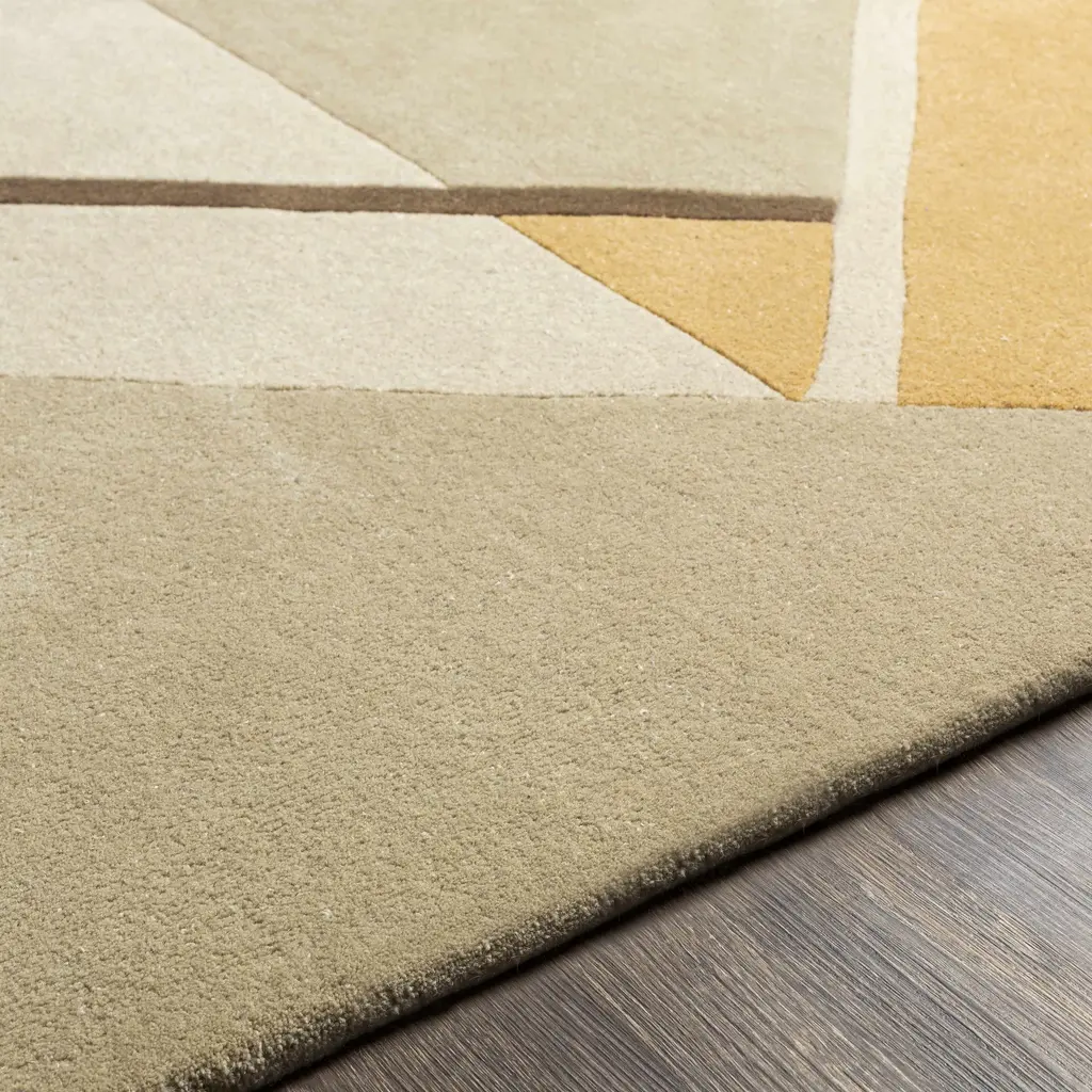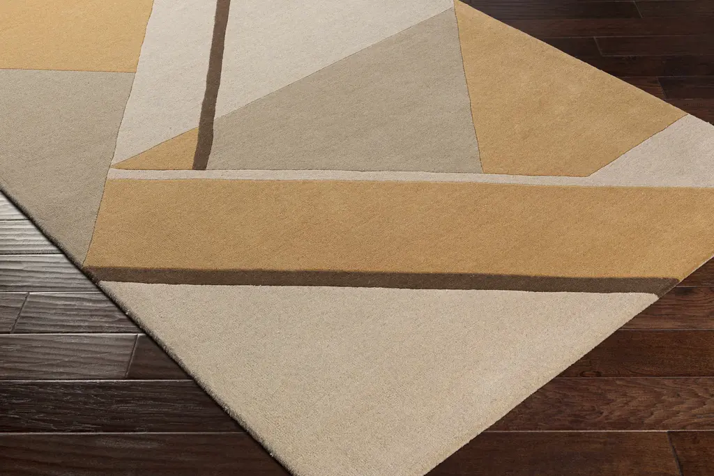 Collection: Saranap Colors: Camel, Dark Brown, Gray, Medium Gray Construction: Hand Tufted Material: Face: 100% Wool Pile: Medium Pile Pile Height: 0.39" Styles: Contemporary Backing: Canvas Made In: India Thickness: 0.55" Price Range: $$$$$ (Affordable)