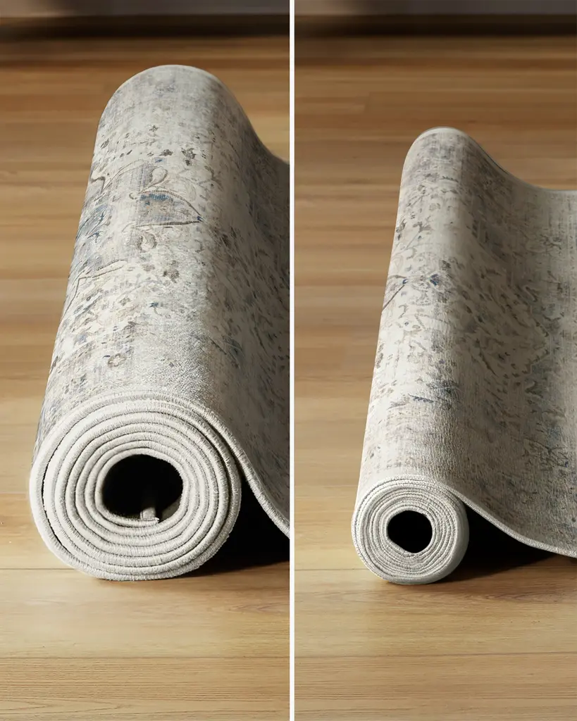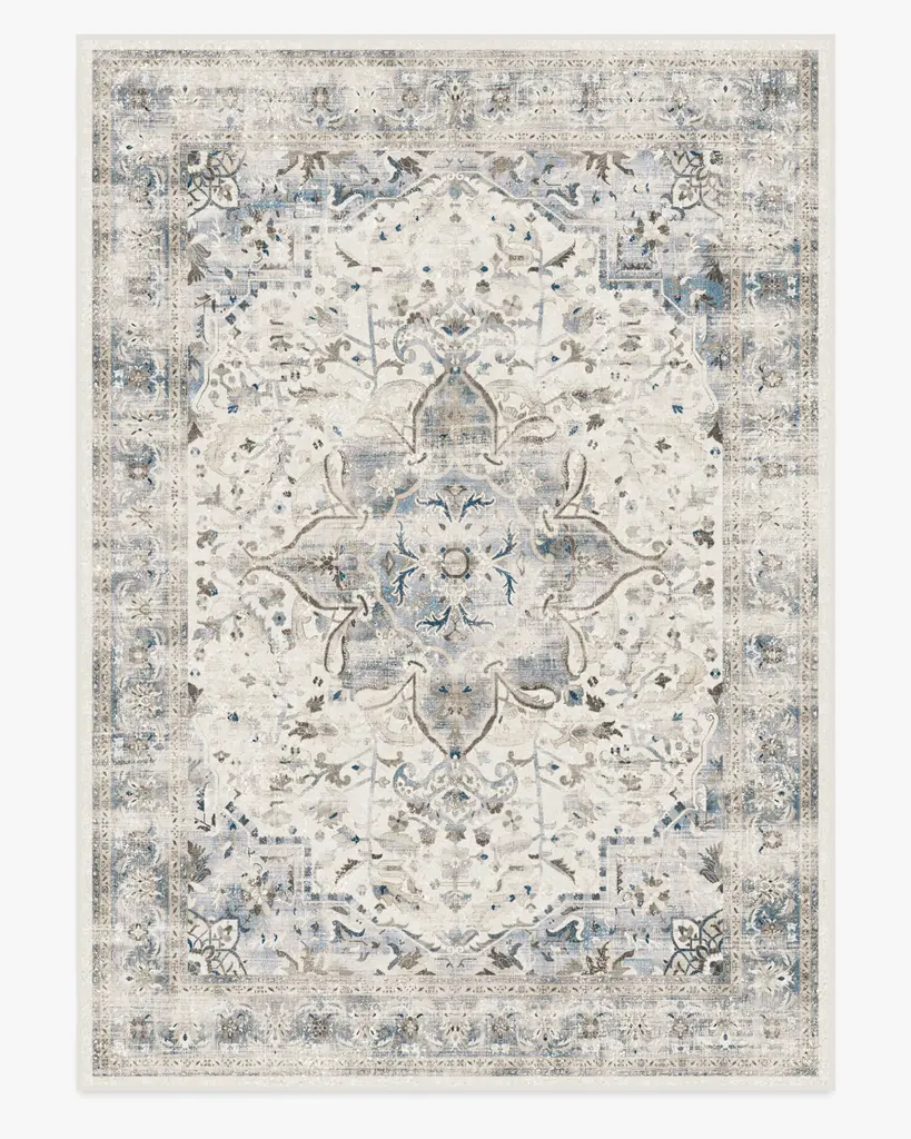 Vintage with a touch of chic. Our Sarrah Blue Quartz Rug features a floral medallion and decorated border in shades of slate and sapphire blue balanced with off-white. The whitewashing effect gives this rug a vintage feel. Water-resistant, stain-resistant, and machine-washable.