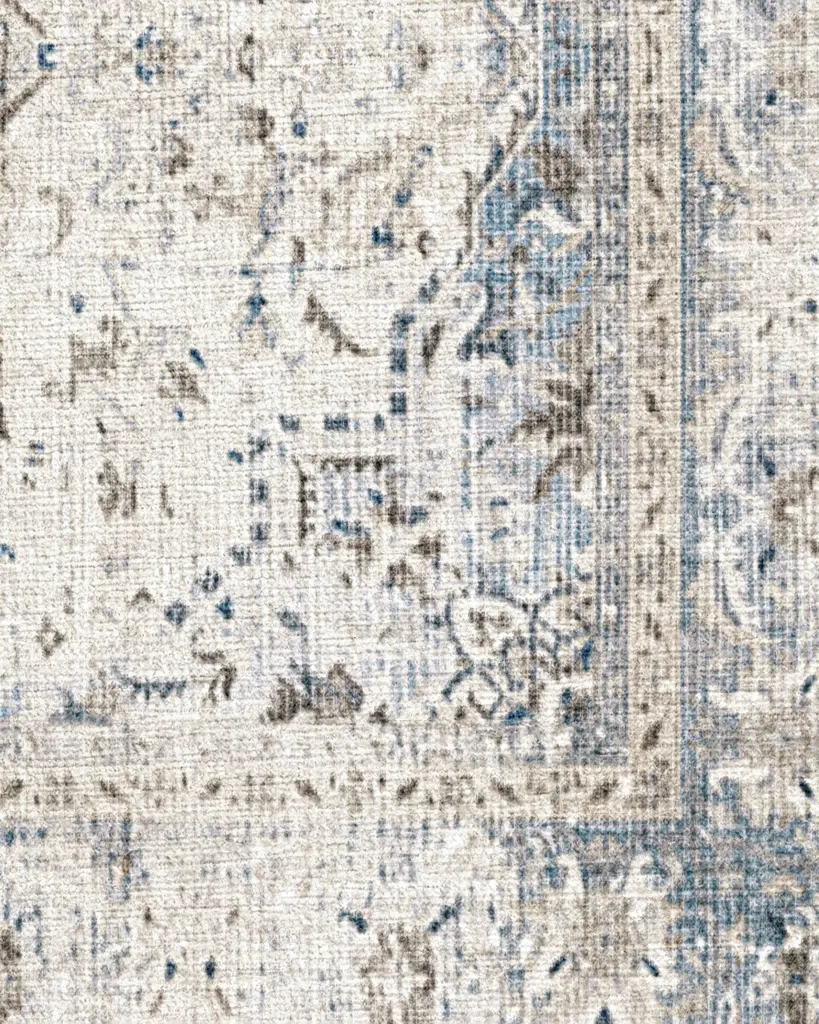 Vintage with a touch of chic. Our Sarrah Blue Quartz Rug features a floral medallion and decorated border in shades of slate and sapphire blue balanced with off-white. The whitewashing effect gives this rug a vintage feel. Water-resistant, stain-resistant, and machine-washable.