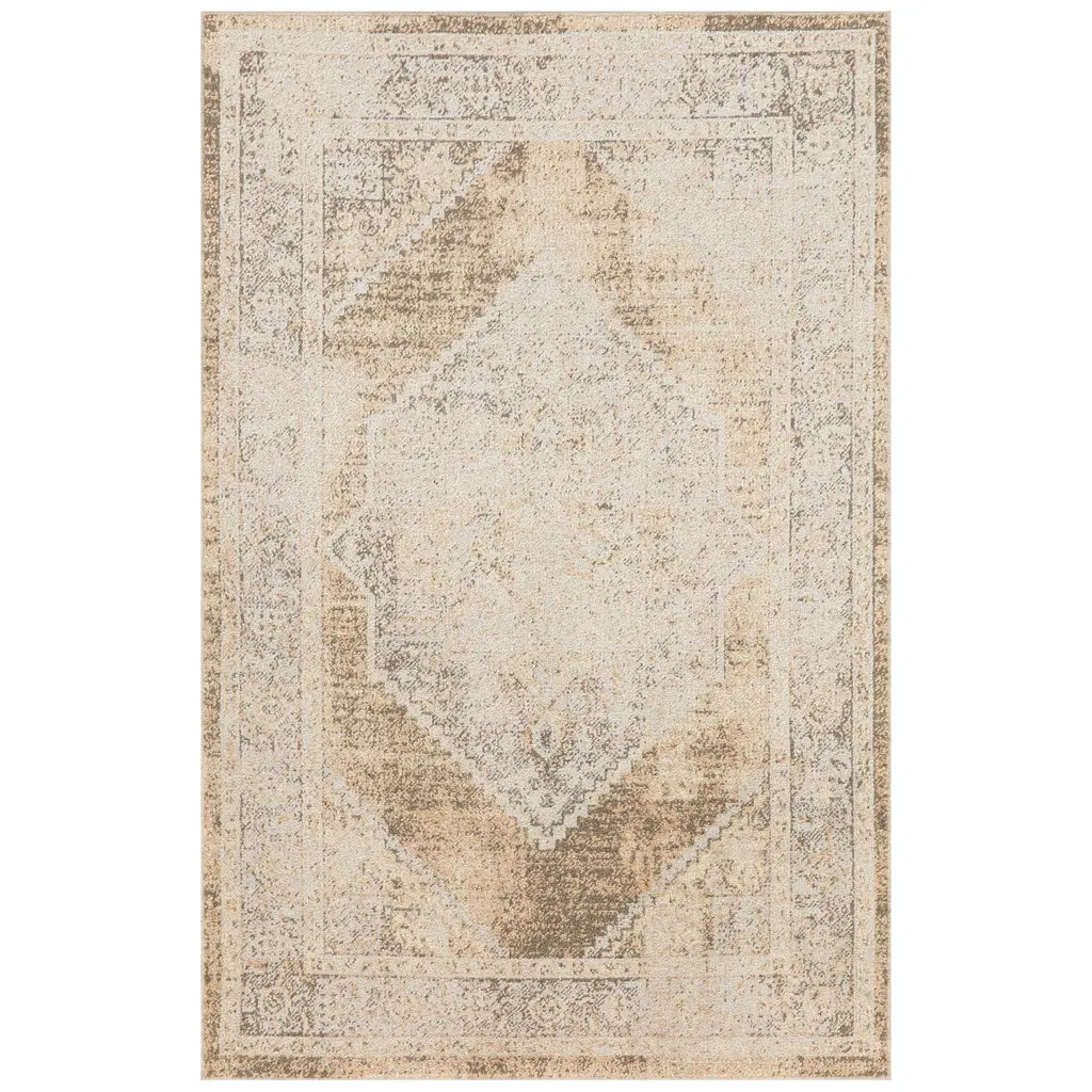 Warm and rustic. Shades of cream, brown, and hazel blend together in this rug to create a beautifully rich, distressed design featuring a floral medallion and border. Water-resistant, stain-resistant, and machine-washable.