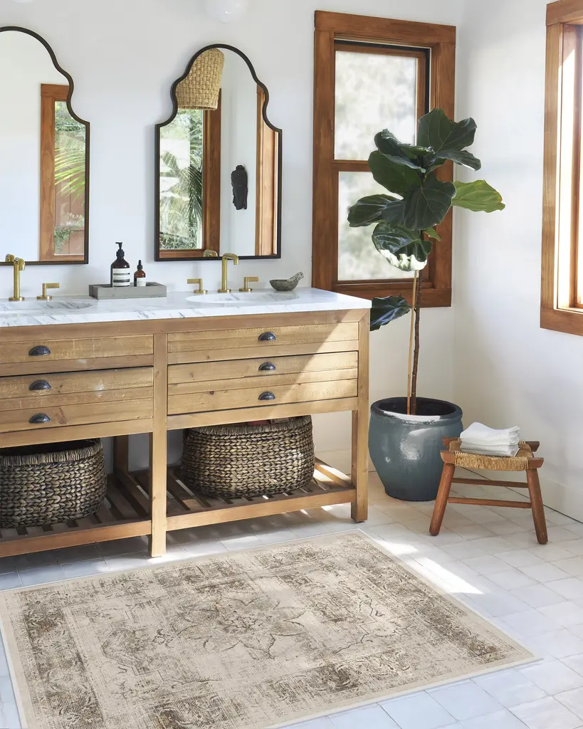 Warm and rustic. Shades of cream, brown, and hazel blend together in this rug to create a beautifully rich, distressed design featuring a floral medallion and border. Water-resistant, stain-resistant, and machine-washable.