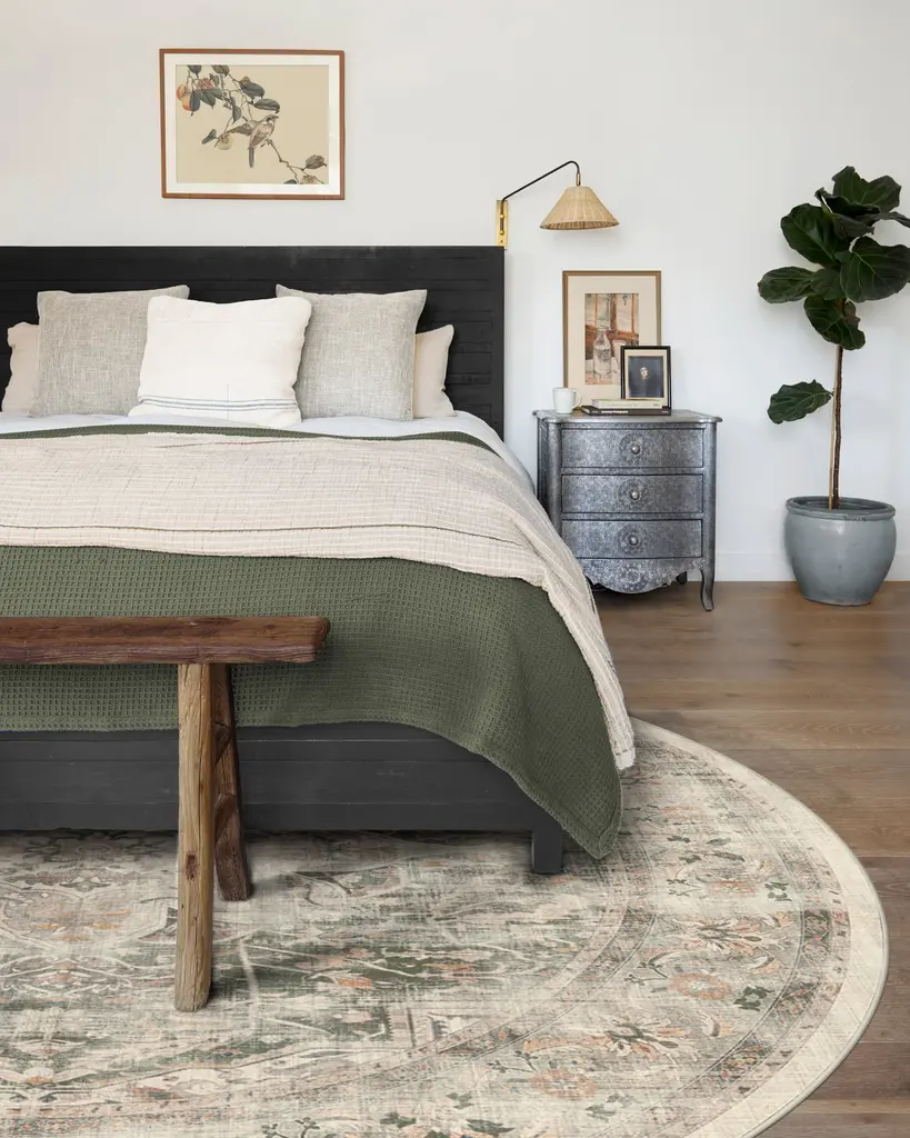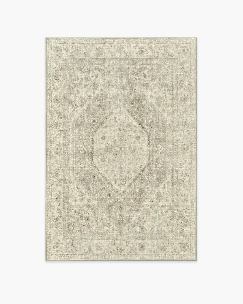 Rustic and earthy. Our Sarrah Sage Rug features a floral medallion and decorated border in shades of sage and hunter green, orange, gold, beige, taupe, and blue. Water-resistant, stain-resistant, and machine-washable.