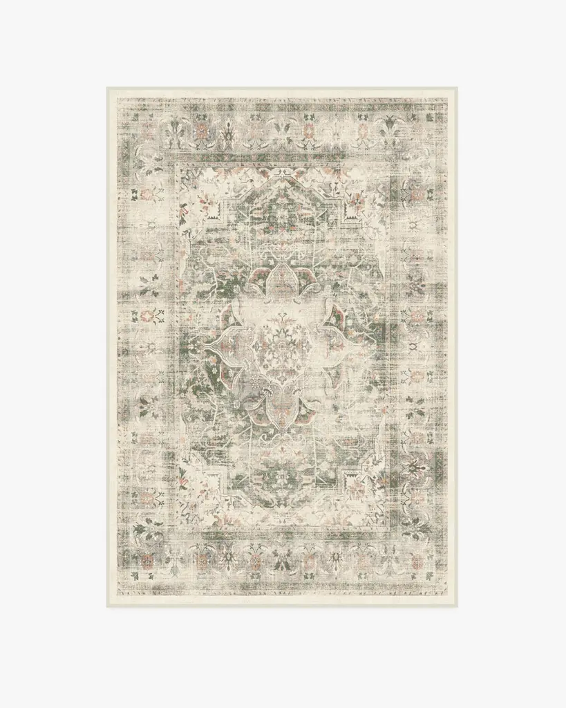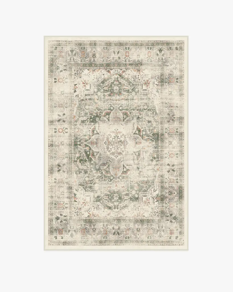 Rustic and earthy. Our Sarrah Sage Rug features a floral medallion and decorated border in shades of sage and hunter green, orange, gold, beige, taupe, and blue. Water-resistant, stain-resistant, and machine-washable.
