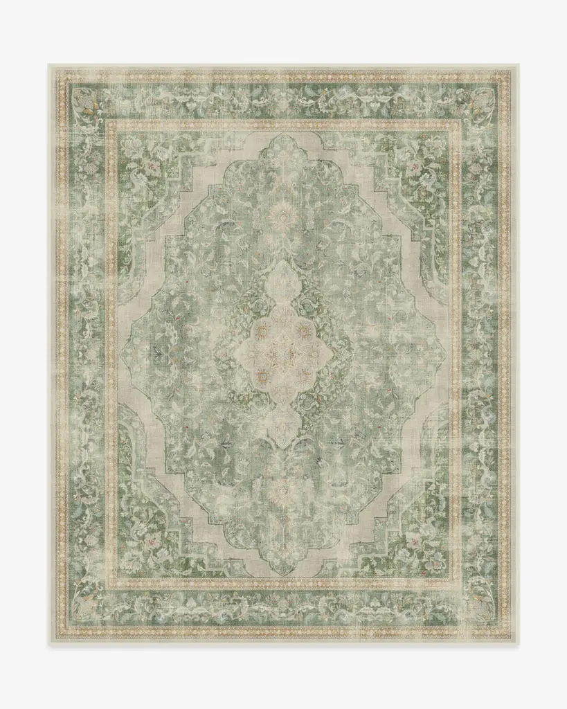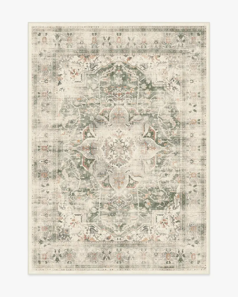 Rustic and earthy. Our Sarrah Sage Rug features a floral medallion and decorated border in shades of sage and hunter green, orange, gold, beige, taupe, and blue. Water-resistant, stain-resistant, and machine-washable.