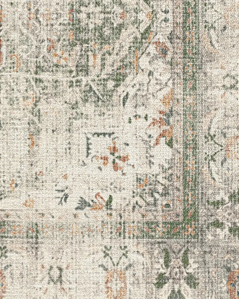 Rustic and earthy. Our Sarrah Sage Rug features a floral medallion and decorated border in shades of sage and hunter green, orange, gold, beige, taupe, and blue. Water-resistant, stain-resistant, and machine-washable.