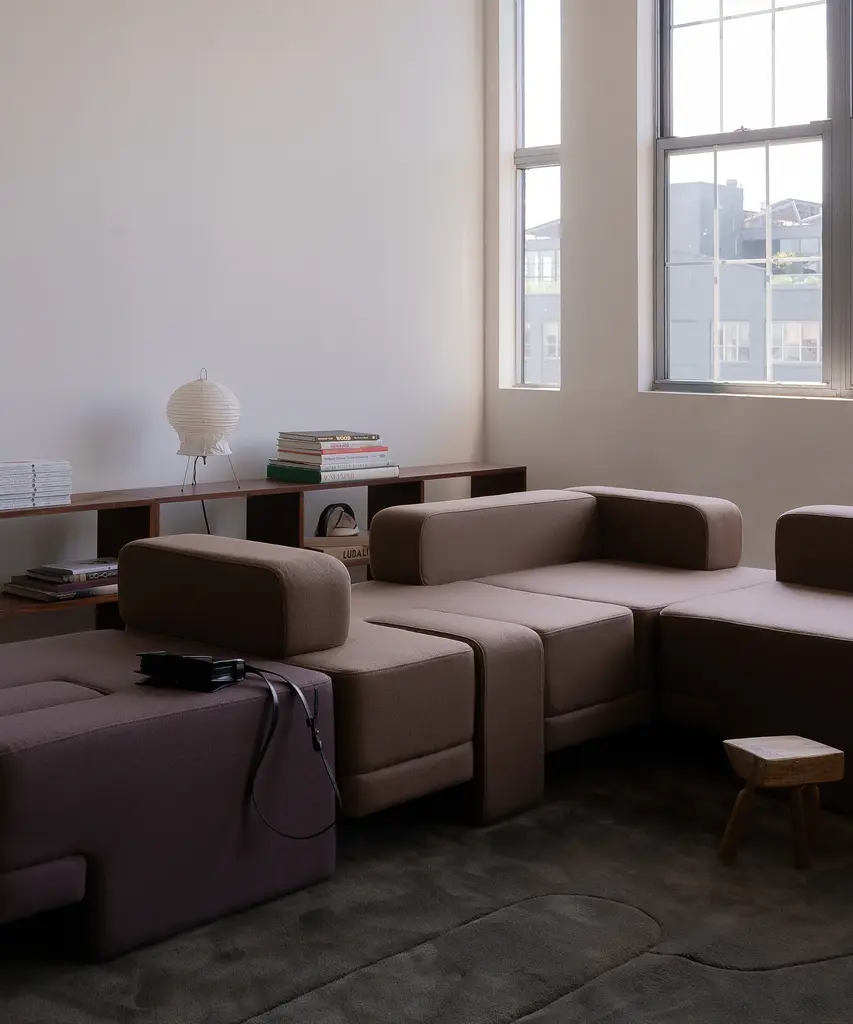 The Sarsen Series, designed by MKCA for TRNK Collection, embraces the dynamic interplay of objects, while emphasizing articulation and open-endedness. Drawing inspiration from joinery, the seating’s asymmetrical distribution of heft and lift ensures visual continuity throughout limitless configurations. The irregular shapes of the rugs reinforce the multidirectional nature of the collection, intending to ground a space without giving it hard boundaries. The Sarsen Series highlights the transformative power of elements in shaping function, habitation, and interaction.