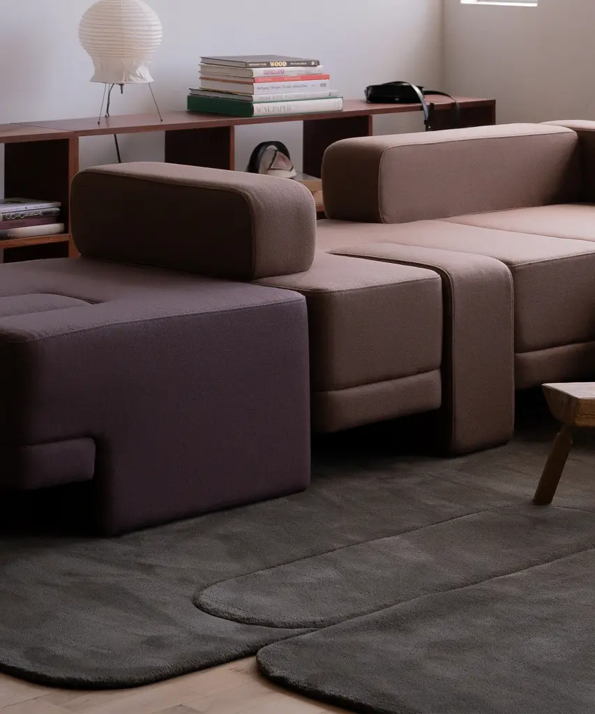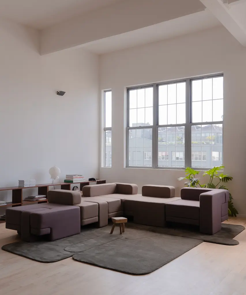 The Sarsen Series, designed by MKCA for TRNK Collection, embraces the dynamic interplay of objects, while emphasizing articulation and open-endedness. Drawing inspiration from joinery, the seating’s asymmetrical distribution of heft and lift ensures visual continuity throughout limitless configurations. The irregular shapes of the rugs reinforce the multidirectional nature of the collection, intending to ground a space without giving it hard boundaries. The Sarsen Series highlights the transformative power of elements in shaping function, habitation, and interaction.
