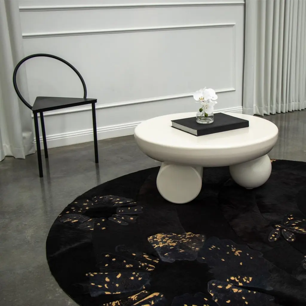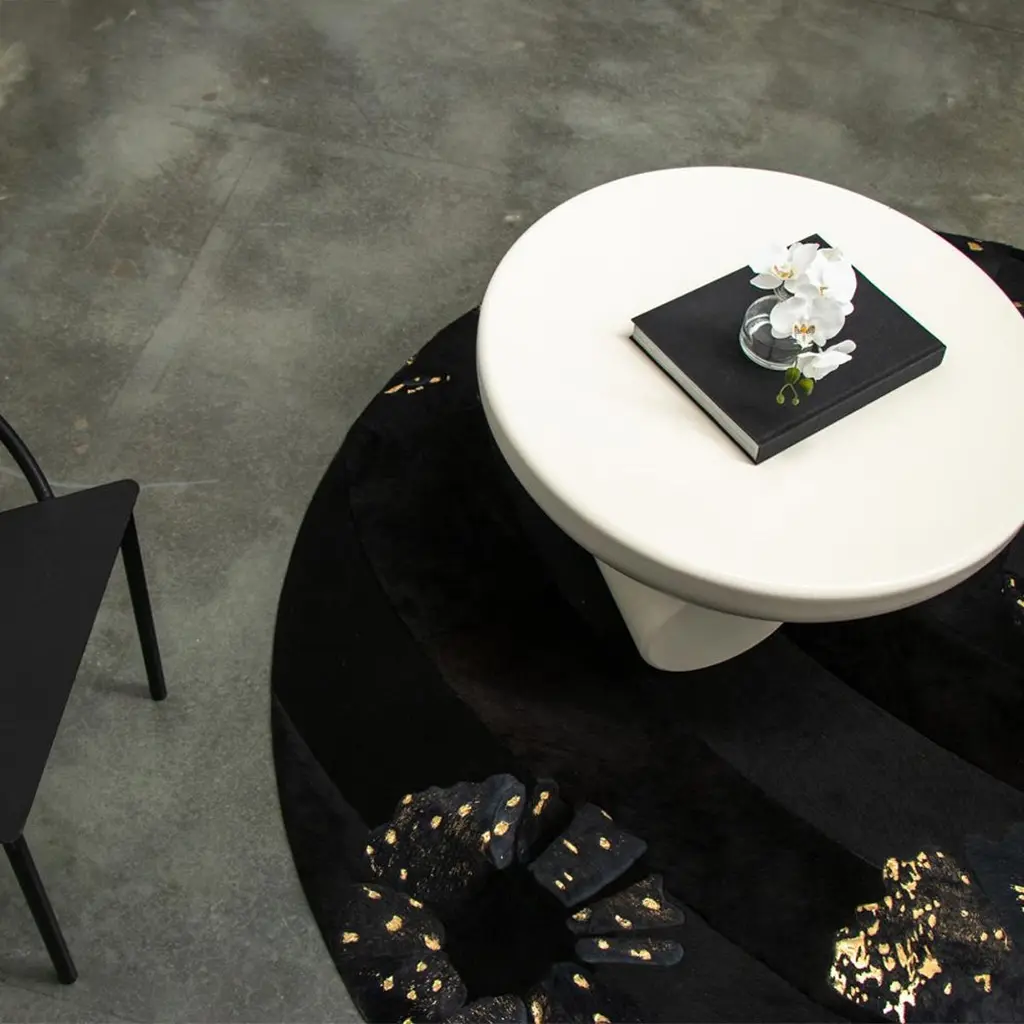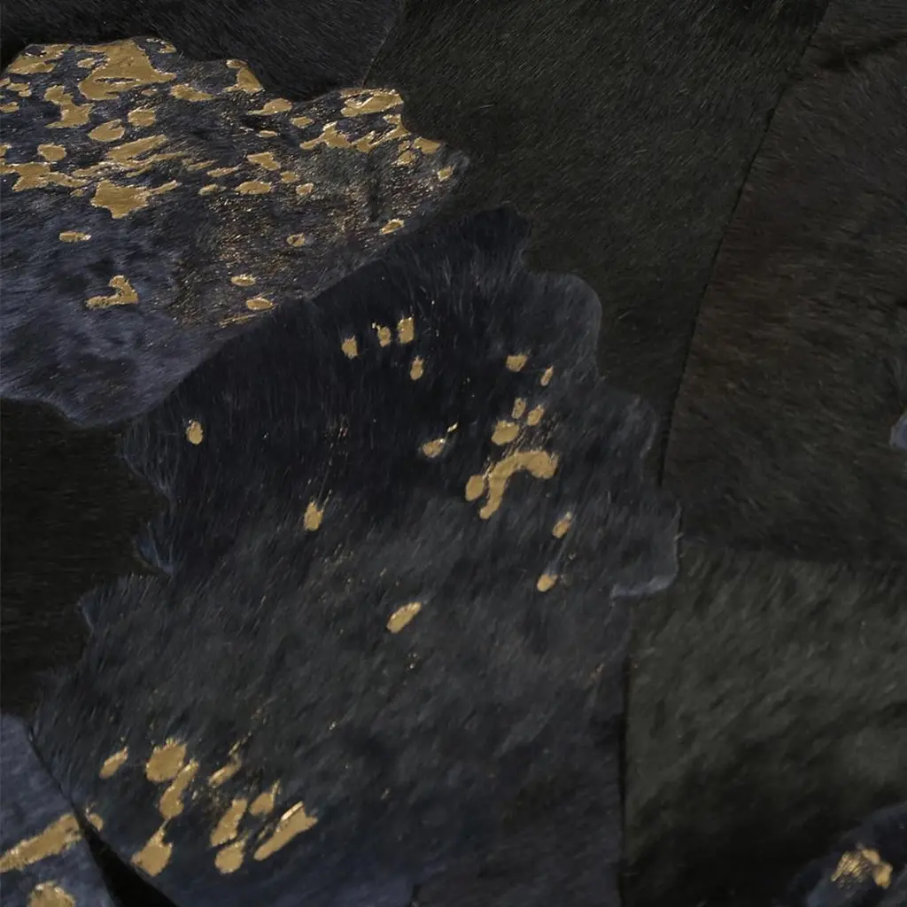 Ancient artistry meets modern luxury in striking monochrome embellished with glittering gold. Sasha Bikoff transforms the centuries-old Japanese shibori technique into a contemporary masterpiece. This exclusive rug showcases dramatic gradations of black, & charcoal, with splashes of gold —a sophisticated palette that commands attention while maintaining timeless elegance.Art Hide's revolutionary Fusion technique creates seamless perfection without a single stitch. The result? A plush 1/4-inch thick surface that's built to last, with no rug pad required.Key Features:Zero-stitch construction for flawless finishCustom sizing and shaping availableExceptional durability with latex-backed constructionRich monochrome palette in black, charcoal, and gold tonesHandcrafted luxury meets innovative techniqueFull customization available in any size, shape, or color