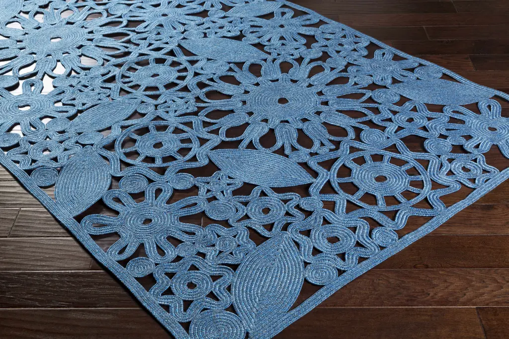 Collection: Sauquoit Colors: Blue Construction: Hand Woven Material: Face: 60% Polypropylene, 20% Polyester, 20% Viscose Pile: Medium Pile Pile Height: 0.3" Styles: Outdoor Outdoor Safe: Yes Made In: India Thickness: 0.24" Price Range: $$$$$ (Affordable)