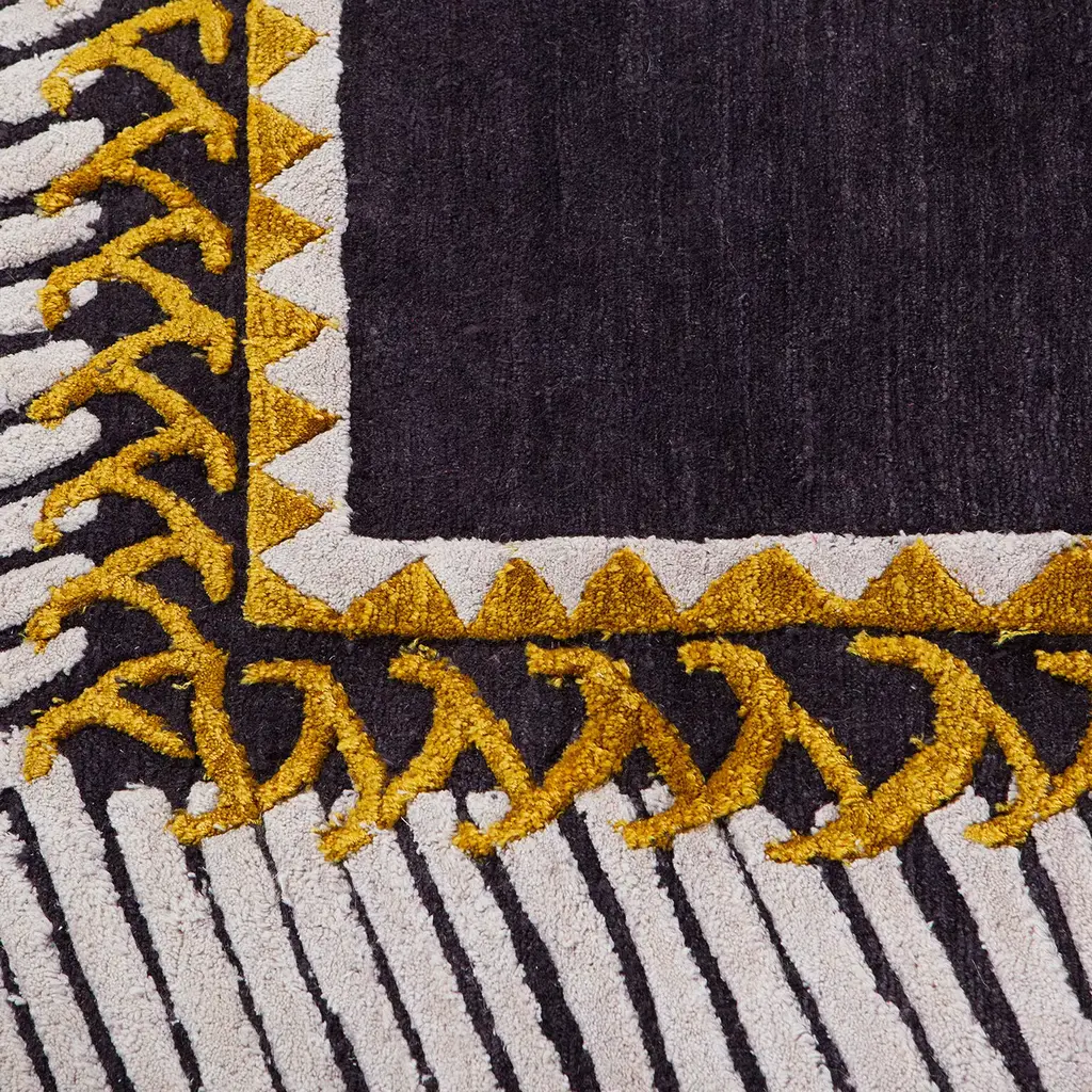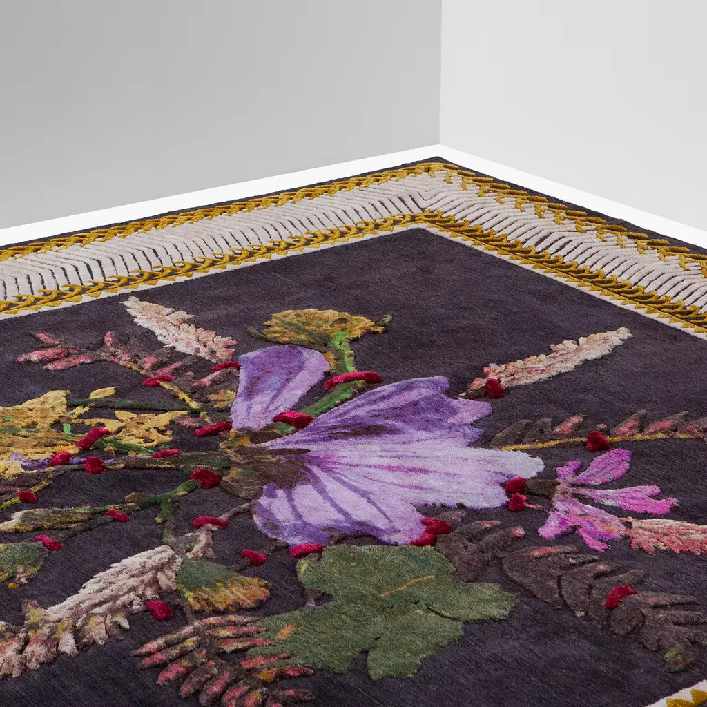 This rug exquisitely reinterprets a classic still life with modern charm: set on a dark background, the central pink and lilac flowers with delicate frond elements are framed by a thick white border with a yellow edge. Designed by Kiki Van Eijk in 2012, this superb rug is part of an 8-piece limited edition entirely hand-knotted in Nepal by local artisans using a combination of linen, banana silk, bamboo silk, and natural silk. It features 150 knots per inch and a 10mm-high pile.
