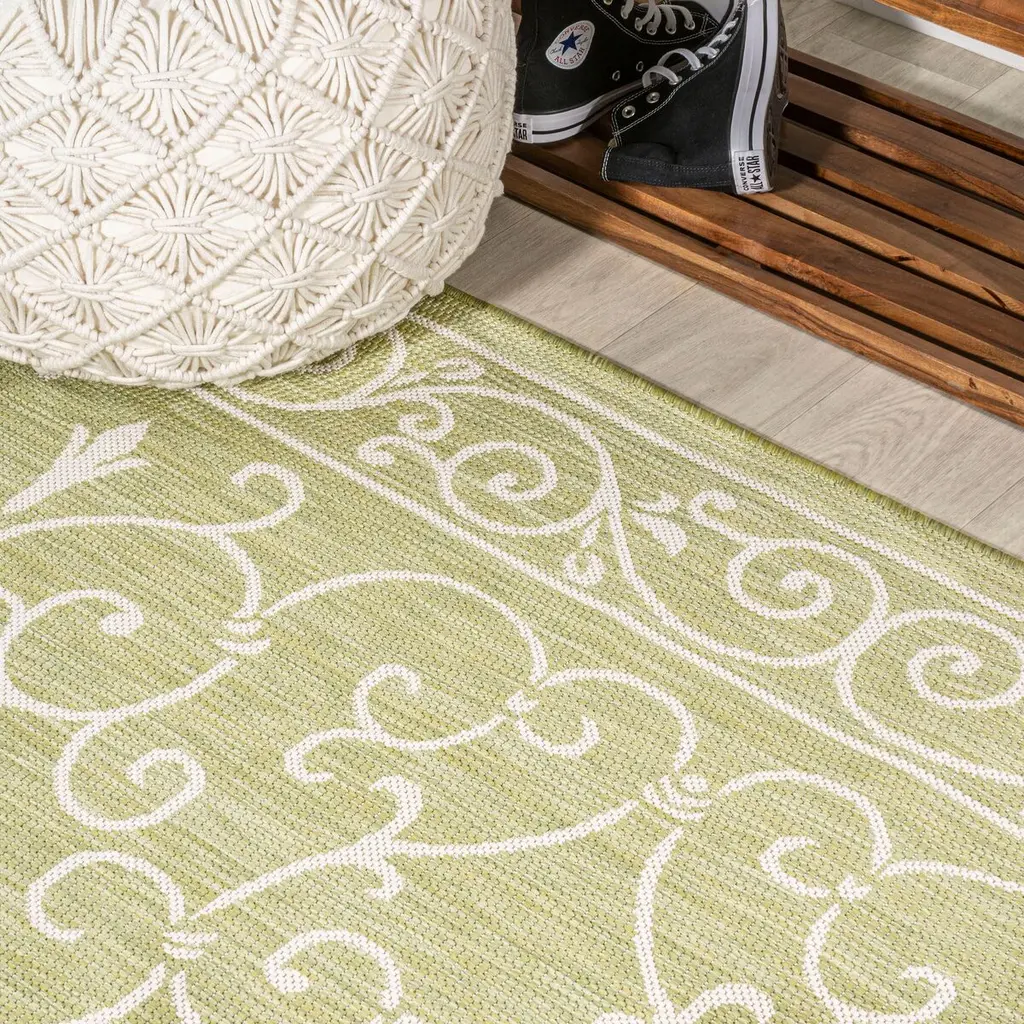 A filigree motif reminiscent of Old World iron gates adorns this polypropylene flat-weave rug, which can withstand the elements while maintaining its timeless flair. A rug pad is recommended to help prevent slipping and extend the life of the rug.