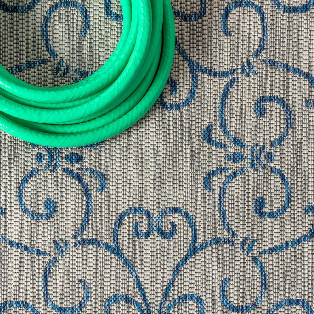 A filigree motif reminiscent of Old World iron gates adorns this polypropylene flat-weave rug, which can withstand the elements while maintaining its timeless flair. A rug pad is recommended to help prevent slipping and extend the life of the rug.