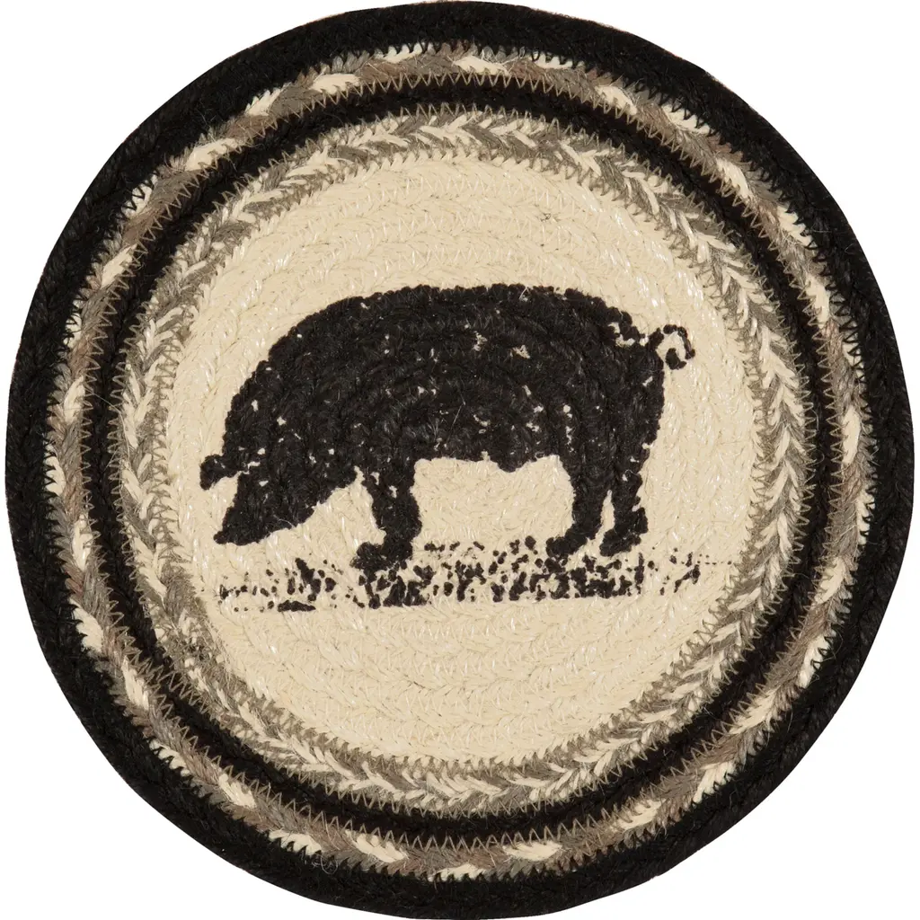 Place the Sawyer Mill Charcoal Pig Jute Trivet on your table for a true farmhouse addition to your home. In the center, a weathered pig is stenciled in black on an ivory background and surrounded by concentric braids of black, grey taupe, silver, and ivory. Use to protect your surfaces from heat, scuffs, or condensation while enjoying the natural texture of this jute trivet.Features PREMIUM CONSTRUCTION: with over two decades experience crafting goods for American homes, our items are built to last for years to come.FARMHOUSE DECOR: fits your farmhouse home with updated country style.QUALITY MATERIAL: made with durable 100% jute for a proper look and feel.FARMHOUSE PIG: This trivet contains bleached braided jute center accented with black, bleached, silver, and grey taupe braided border, pig stenciled in center in distressed blackDURABLE & STRONG: Machine stitching holds braiding together even with increased wear and tearREVERSIBLE: Reverses to same as front but without stencilBRAIDED: Machine braided, Machine stitchedSpecifications Material: 100% JuteDimensions: 8" diameterWeight: 0.1 lbColors: Bleached White, Asphalt, Grey TaupeManufacturer Country: IndiaCare: Spot Clean* To prevent colors from bleeding do not use chemicals or wet clean this item. A rug pad is recommended to keep your surfaces safe from color bleeding and abrasiveness of the jute fibers.