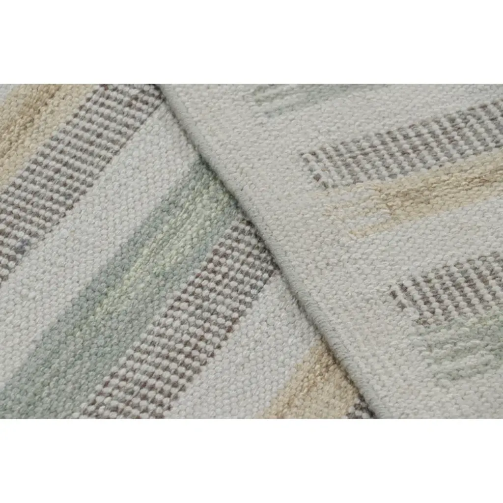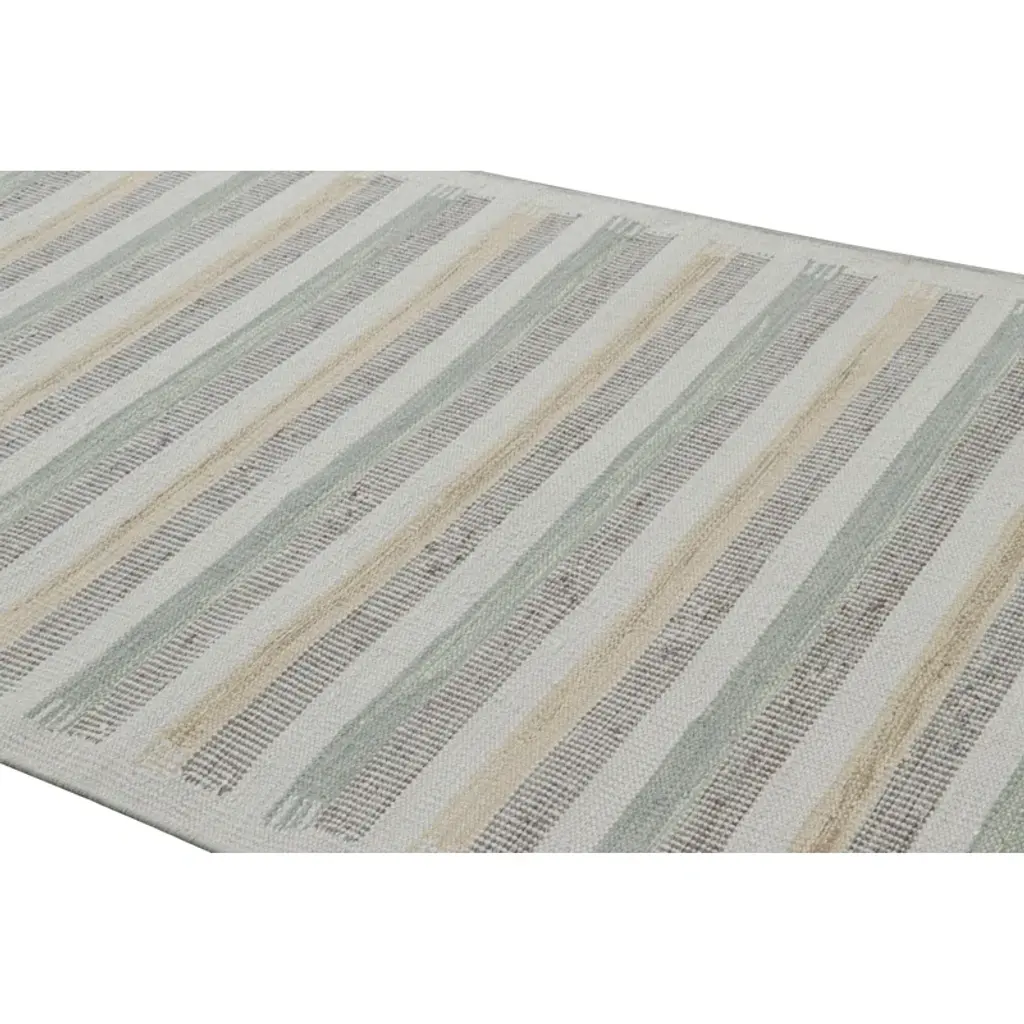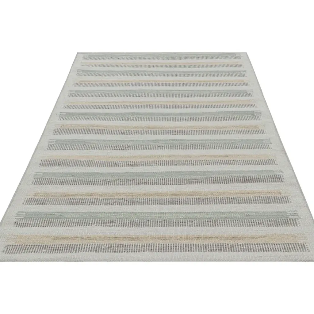 This rug is a new addition to the flatweaves in Rug & Kilim’s award-winning Scandinavian rug collection. Made with handwoven wool, its design is inspired by mid-century Swedish minimalist textile designs of the Rollakhan and Rya weaving traditions.On the Design: This new flat weave reinvents vintage Scandinavian Kilim in ways that both honor the Swedish minimalist aesthetic and modernize its construction. Our use of undyed natural yarns, for example, lends a subtle striae with more of a sense of movement and depth—a subtle nod to Rollakan techniques in a modern fashion. This particular rug enjoys geometric stripes in tones of gray, blue, beige-brown and ivory white, with intricate variations in the color from the aforementioned weaving style. Admirers of the craft will appreciate this proprietary technique of ours that both innovates and honors mid-century weaving techniques inherent to Scandinavian style.Custom Projects:The pricing for our rugs is calculated on a per-square-foot basis and applies to the standard sizes noted. Custom sizes and colors are offered; please contact your dedicated liaison to obtain a formal quote. Expedited lead times are available upon request.