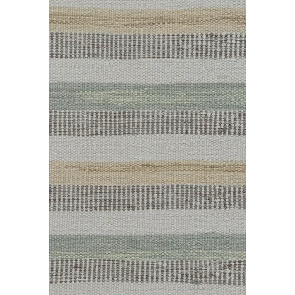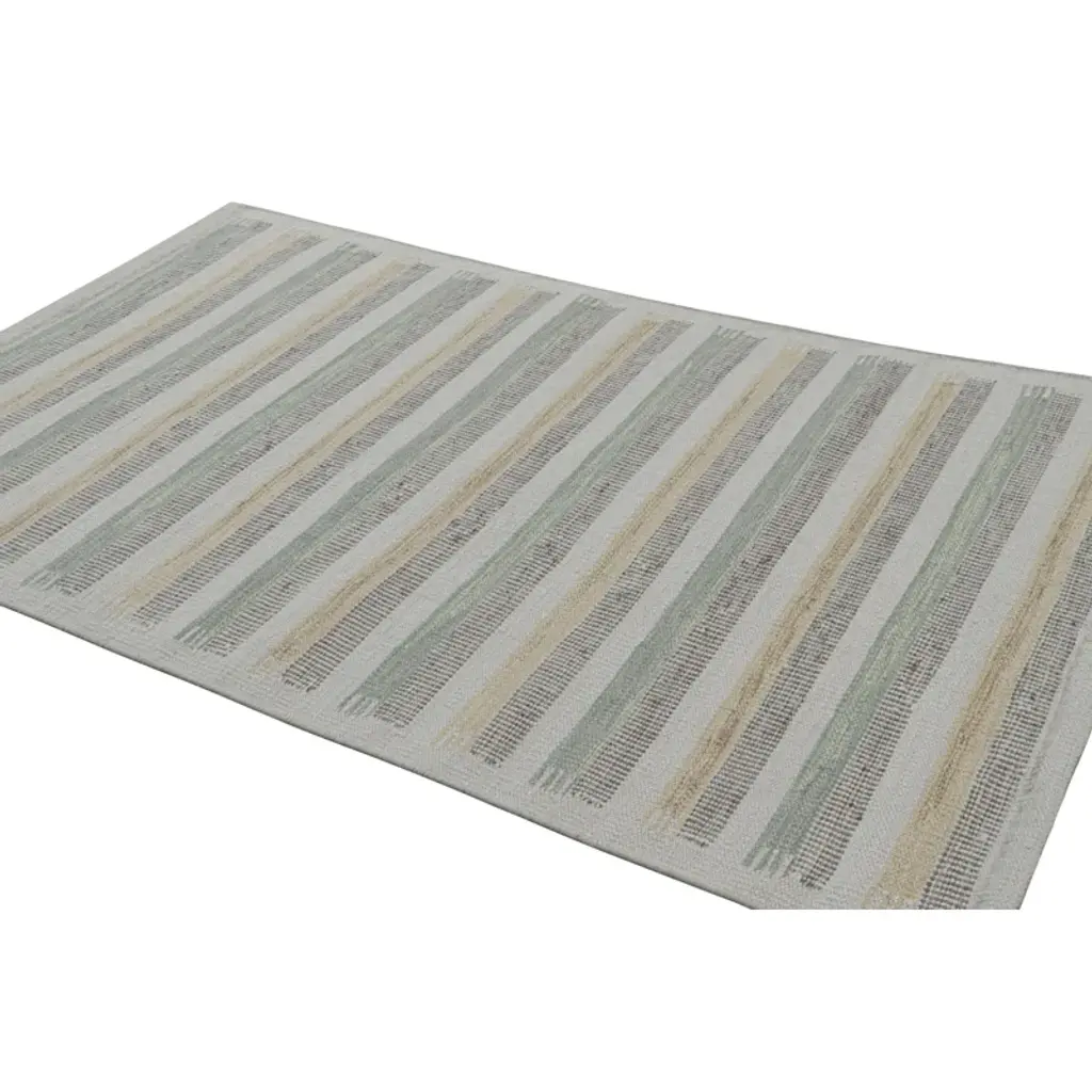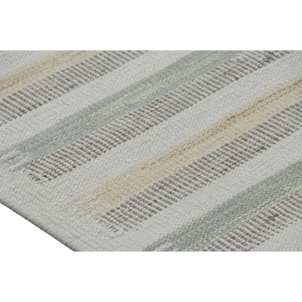 This rug is a new addition to the flatweaves in Rug & Kilim’s award-winning Scandinavian rug collection. Made with handwoven wool, its design is inspired by mid-century Swedish minimalist textile designs of the Rollakhan and Rya weaving traditions.On the Design: This new flat weave reinvents vintage Scandinavian Kilim in ways that both honor the Swedish minimalist aesthetic and modernize its construction. Our use of undyed natural yarns, for example, lends a subtle striae with more of a sense of movement and depth—a subtle nod to Rollakan techniques in a modern fashion. This particular rug enjoys geometric stripes in tones of gray, blue, beige-brown and ivory white, with intricate variations in the color from the aforementioned weaving style. Admirers of the craft will appreciate this proprietary technique of ours that both innovates and honors mid-century weaving techniques inherent to Scandinavian style.Custom Projects:The pricing for our rugs is calculated on a per-square-foot basis and applies to the standard sizes noted. Custom sizes and colors are offered; please contact your dedicated liaison to obtain a formal quote. Expedited lead times are available upon request.