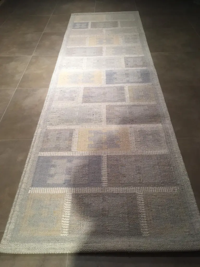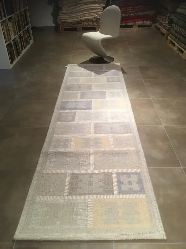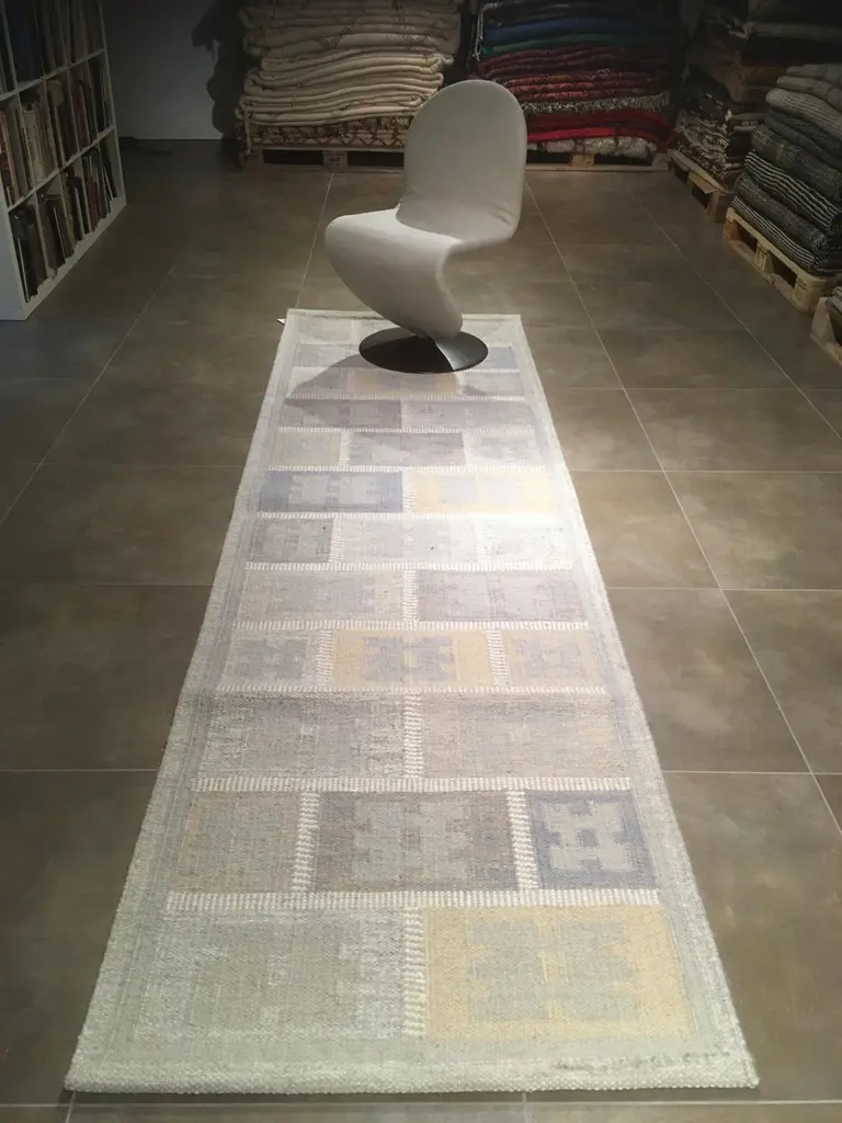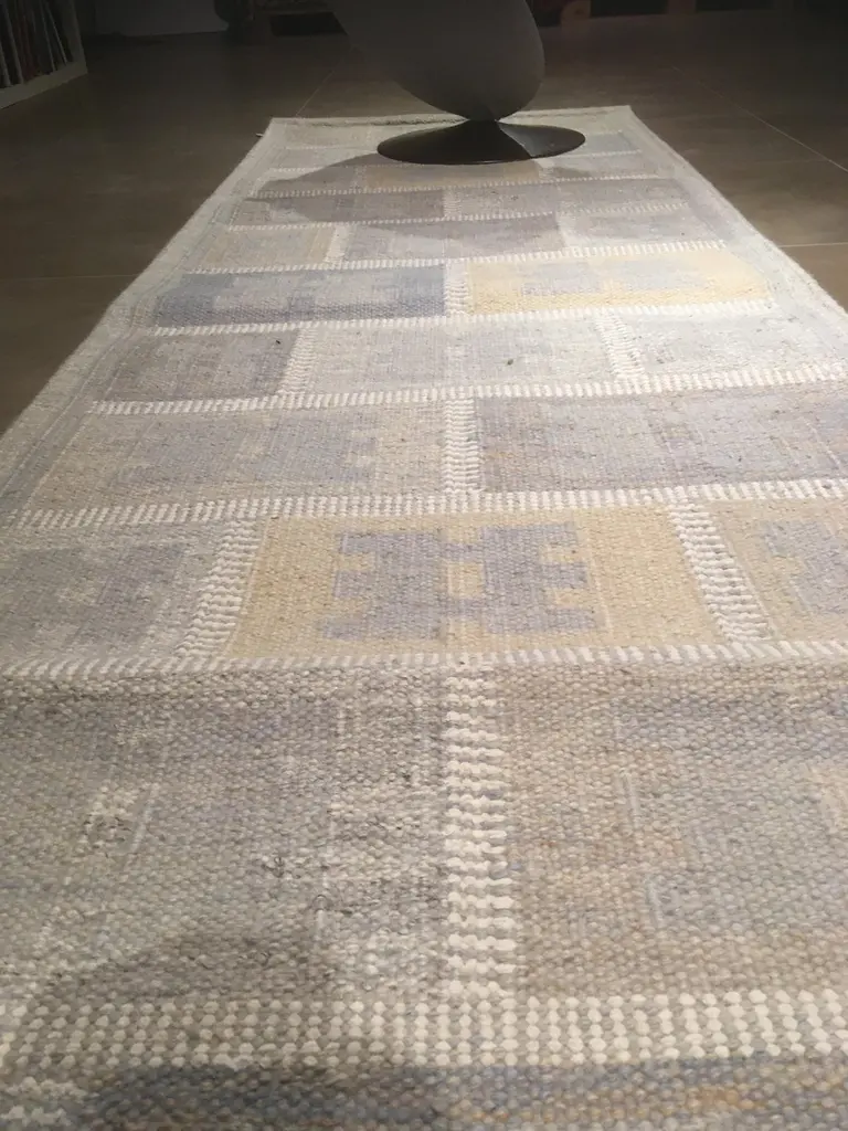 Inspired by Mid-Century Modern Swedish carpets, this Kilim is part of our contemporary collection of textured flat-weaves where the material is employed in such a way as to create a sturdy rug that can be beautifully juxtaposed in today's interiors. This design is called 'Elsa', it is woven in wool and is available in standard as well as custom sizes.