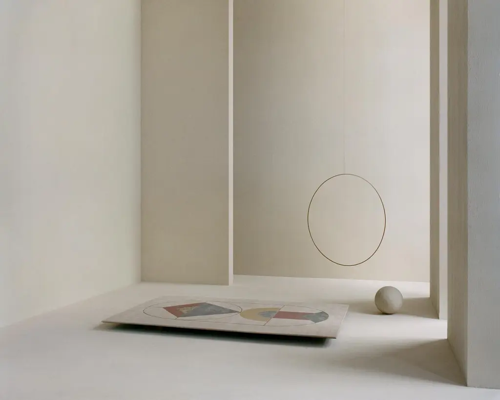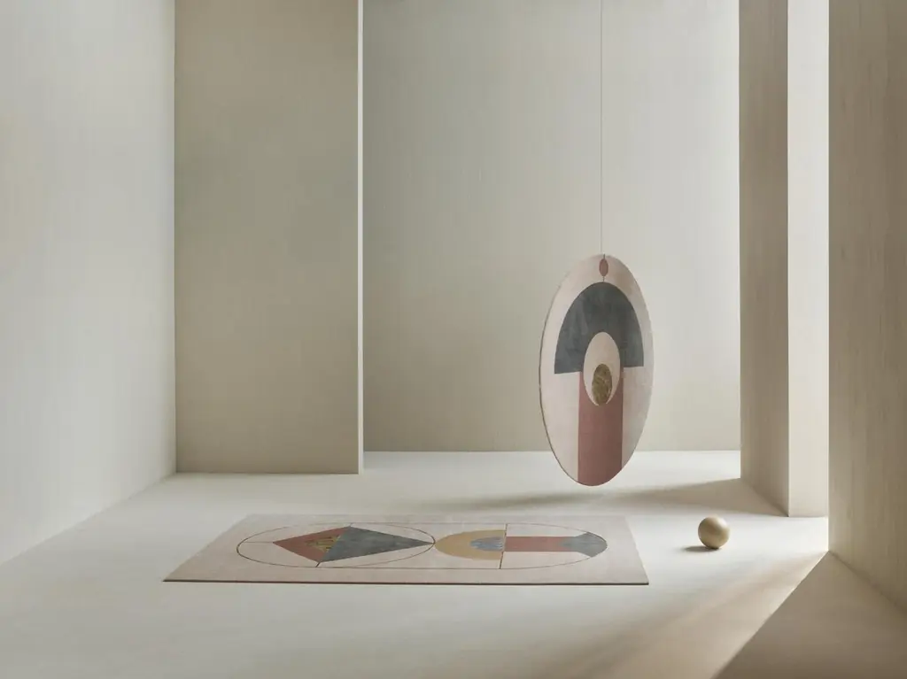 Scenic Spell, 'Dimensuous' collection, by Linie DesignRectangular handmade rug. Wool and silk, hand knotted. Three sizes available: 140/200 cm • 170/240 cm • 200/300 cmAn artistic and visually alluring hand-knotted rug from Linie Design. Eternal Orb uses contrasting colours and shapes to create an intricate design replicated in thousands of tiny knots. Using only natural, sustainable fibres, the rug is crafted in a luxurious blend of RWS wool and silk with an organic cotton warp, which enhances the colours, texture and sheen, while ensuring natural warmth, strength and durability. Hand-knotted by Linie Design’s artisan weavers, designed by Urd Moll Gundermann.