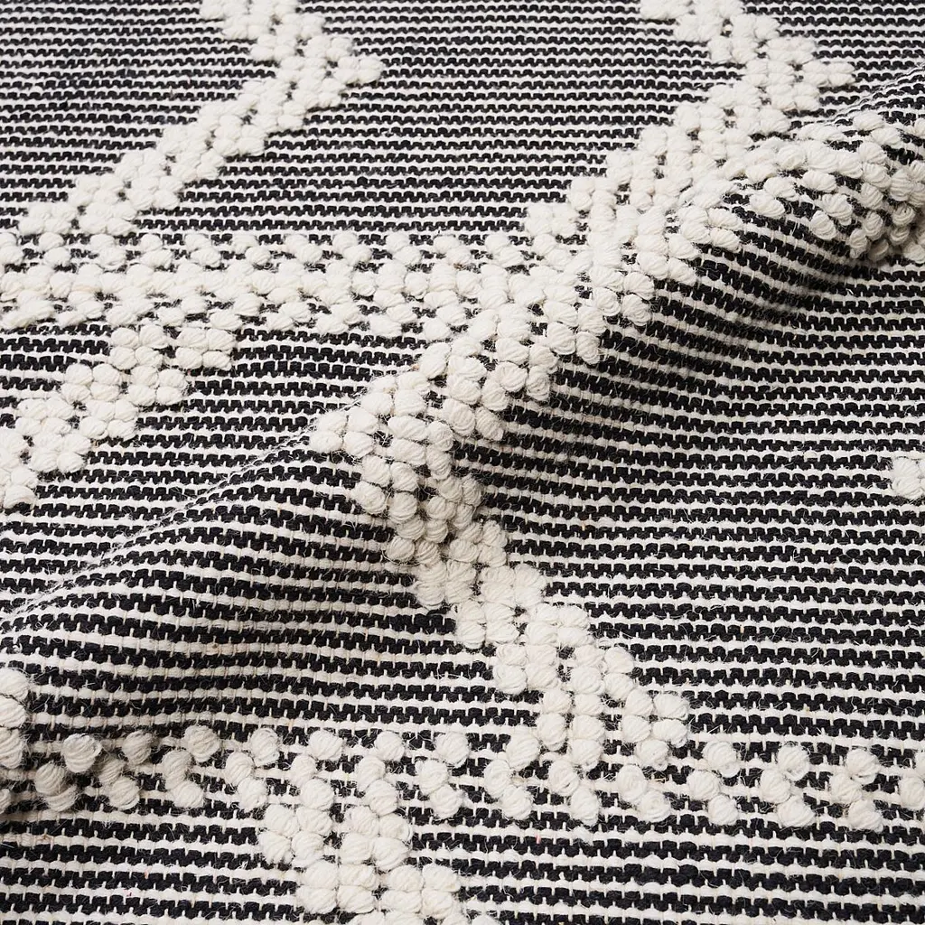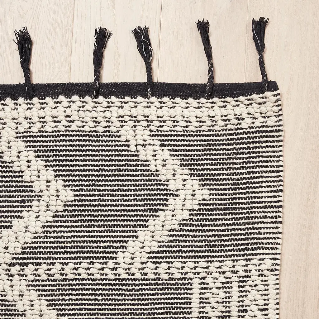 This rug will ship in December. Made of wool and cotton on a traditional pit loom, Malta French Knot is a dynamic stripe with lovely dimension and texture accentuated by tassel fringe. This versatile geometric design has a casual look that works absolutely anywhere.Content:55% Wool, 45% Cotton