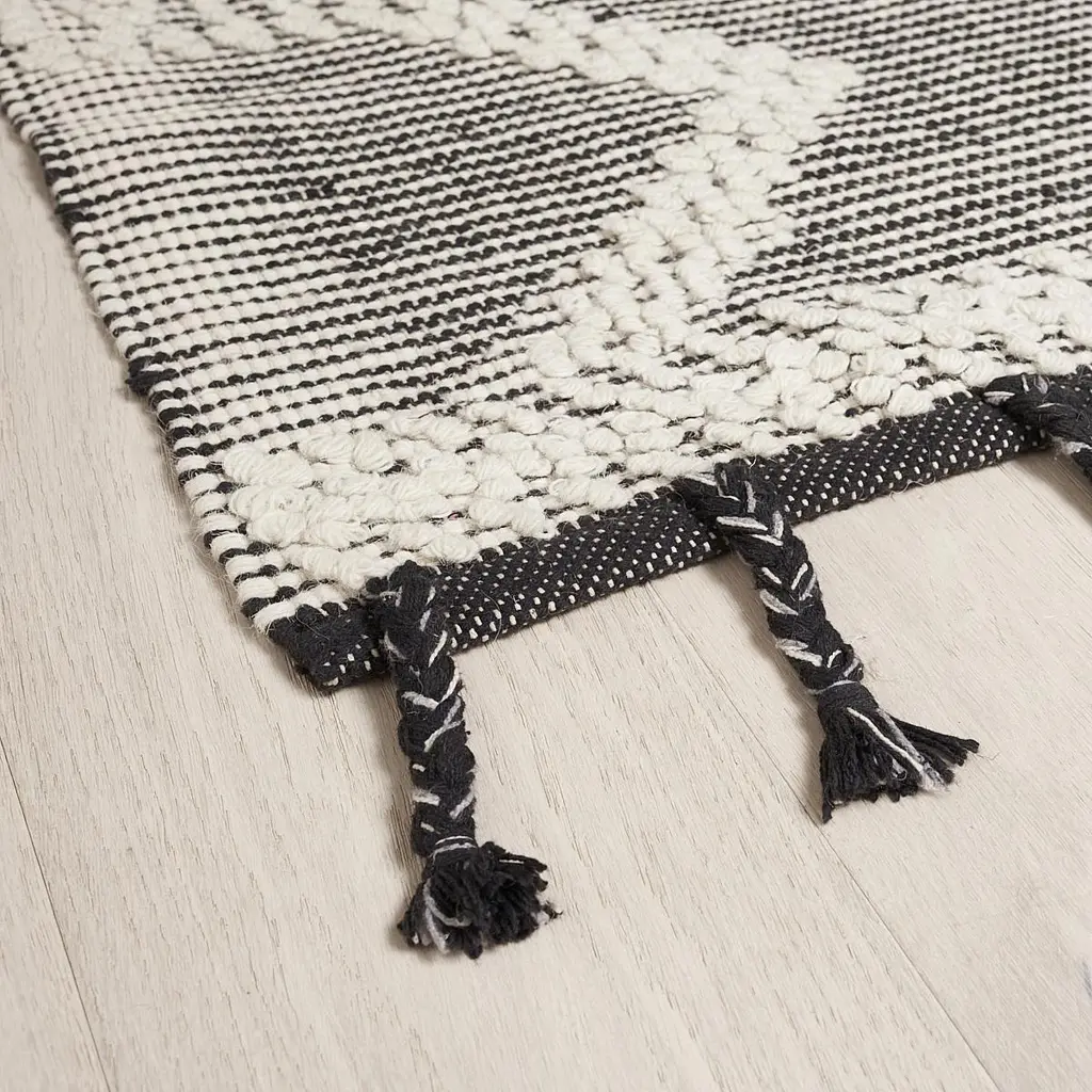 This rug will ship in December. Made of wool and cotton on a traditional pit loom, Malta French Knot is a dynamic stripe with lovely dimension and texture accentuated by tassel fringe. This versatile geometric design has a casual look that works absolutely anywhere.Content:55% Wool, 45% Cotton