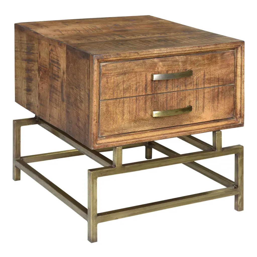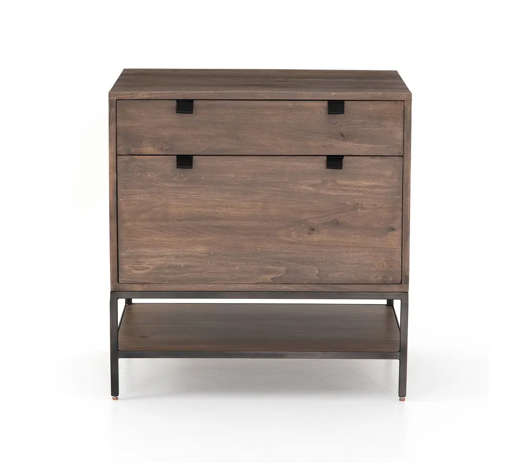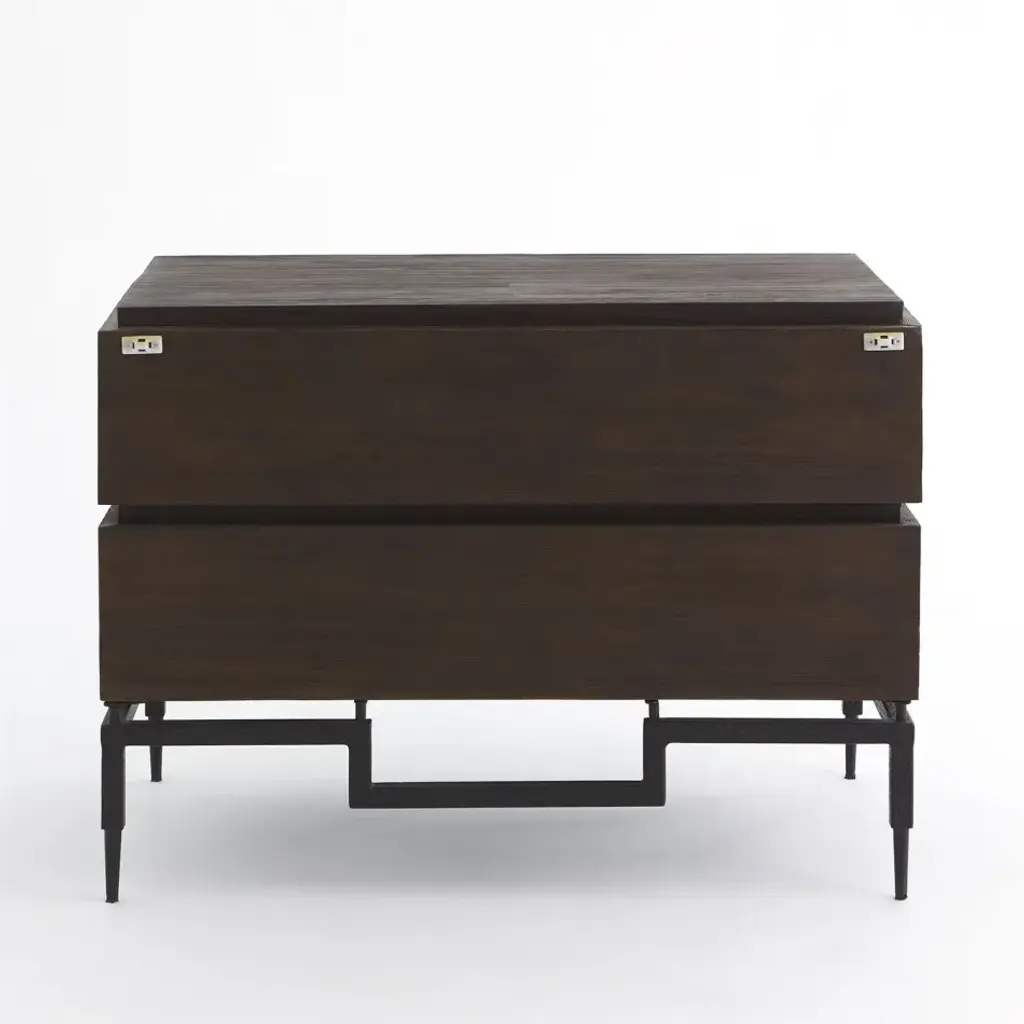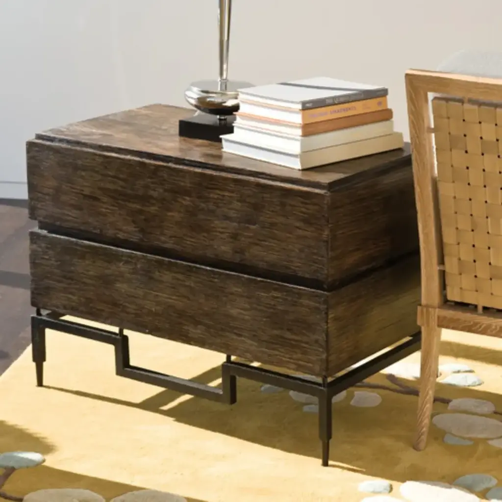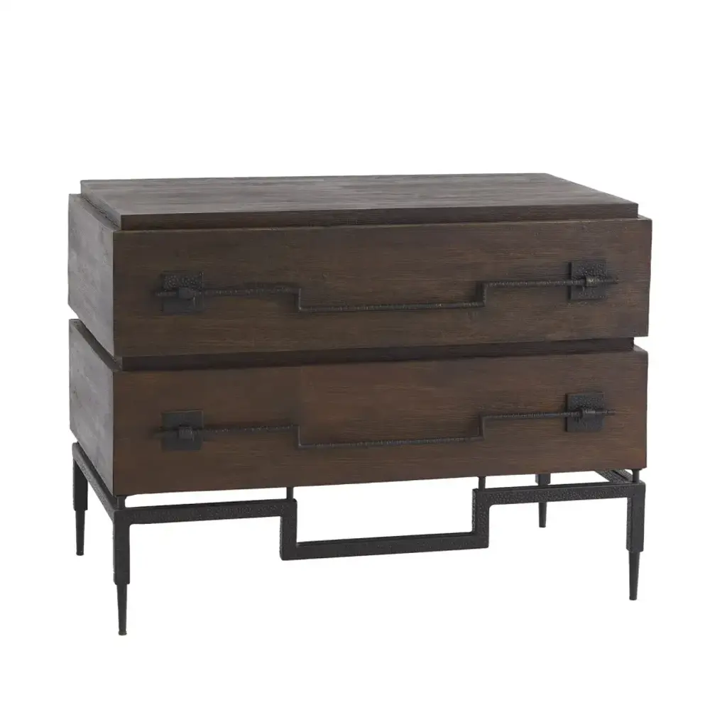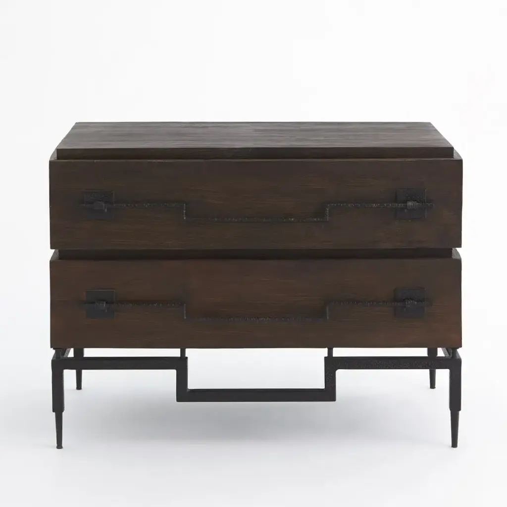 Made of solid mango wood. Texture is hand rubbed by artisans and finished w/brown/black stain and coated in satin lacquer. Completely hand forged metal legs and dramatic pulls. Drawers have black lacquer interiors and full extension metal glides. From a fashion forward perspective, Global Views offers accessories, furniture, statement lighting, and an assortment of rugs and mirrors to add beauty and joy to your home.