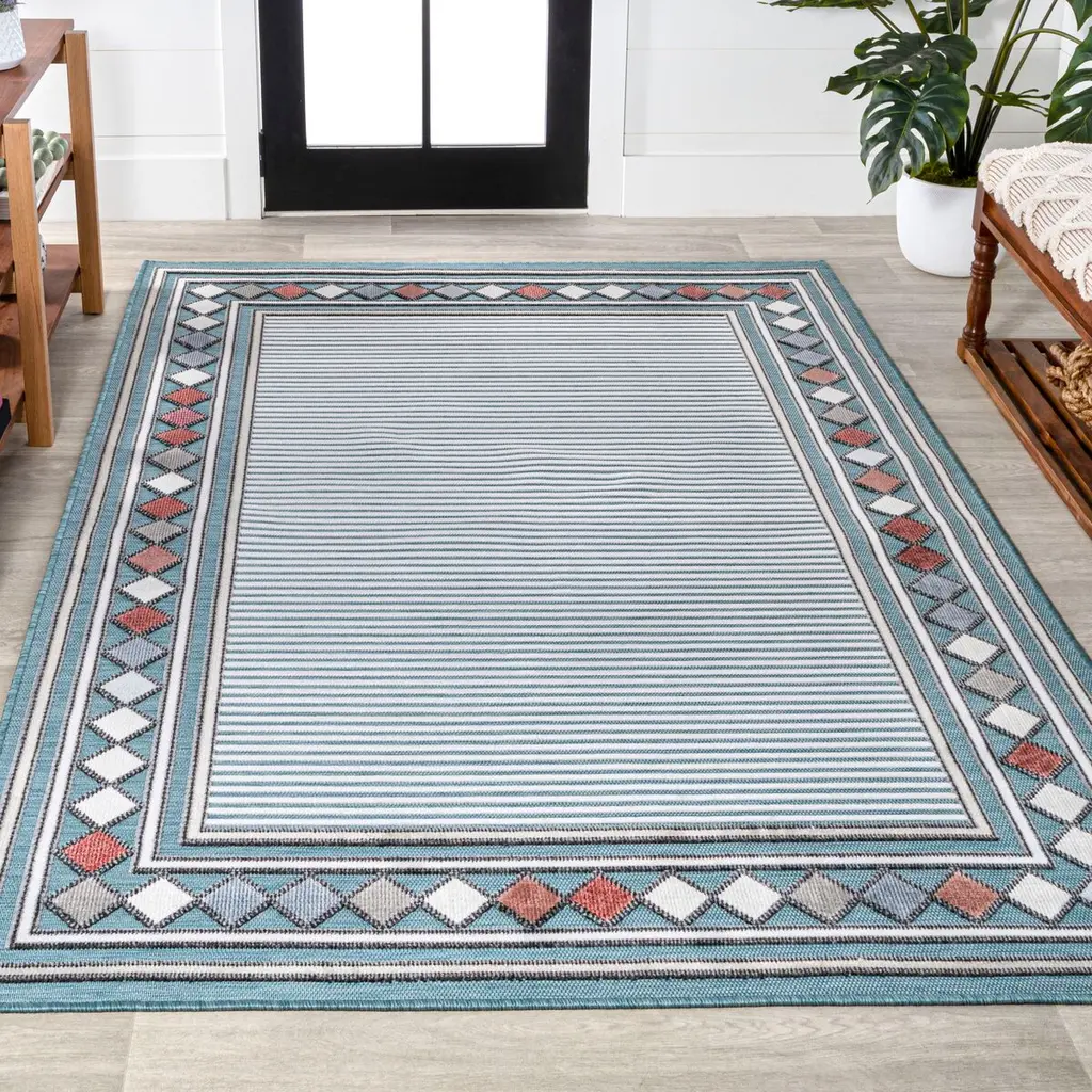 The high-low pile and the multicolor diamond border add to this striped rug's breezy panache. Made of polypropylene, the rug is suitable for use outdoors as well as inside, and you can simply hose it clean. A rug pad is recommended to help prevent slipping and extend the life of the rug.