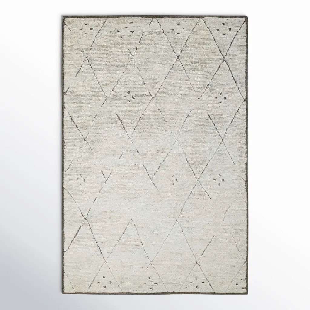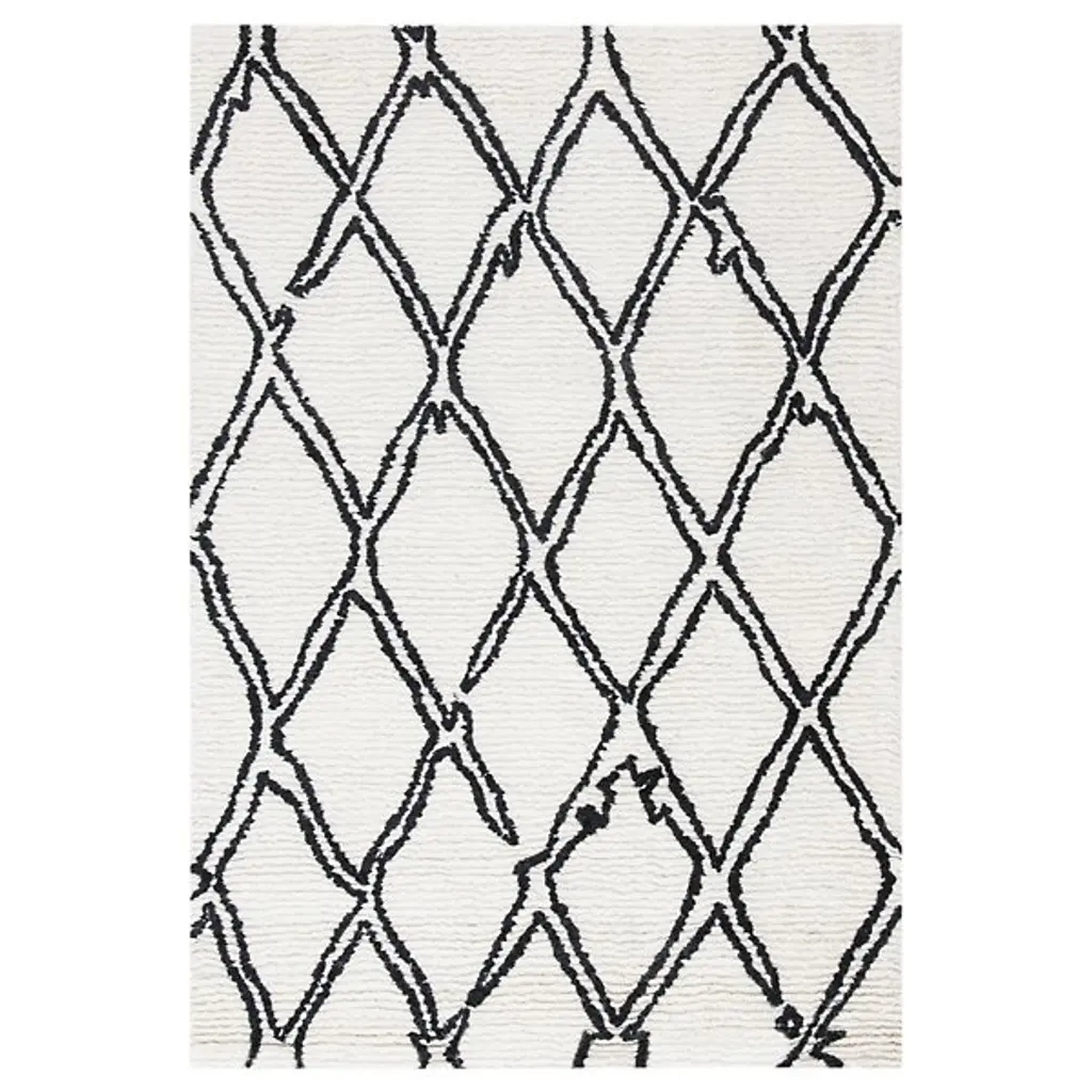 The Seine Square Rug from Alder & Ore presents an enchanting rustic appeal. Each rug is made in India, hand-tufted from a premium polyester and wool blend, this rug features bold black lines scribing dynamic diagonal patterns filled with intricate details. The black details stand out well against an ivory backdrop, and its artisanal modern and bohemian design offers a striking balance of sophistication and warmth, making it an ideal choice for adding texture and elegance to any room.