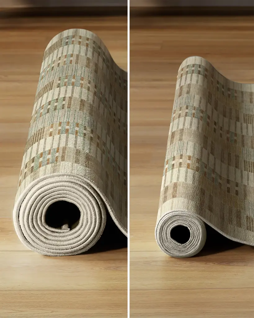 Experience the captivating blend of structure and style of our Architectural Digest Selene Neutral Multicolor Rug, designed by Jessica Jubelirer. Its grid-like design, complemented by an unconventional checkered pattern and playful stripes, brings an organic touch to any space. The warm neutrals, cinnamon brown, sage green, mustard yellow, and taupe are beautifully accented by a soft oatmeal background. Water-resistant, stain-resistant, and machine-washable. Rug colors may vary slightly according to your device and the lighting in your space.