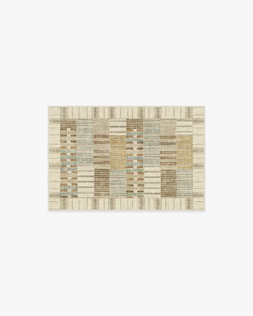 Experience the captivating blend of structure and style of our Architectural Digest Selene Neutral Multicolor Rug, designed by Jessica Jubelirer. Its grid-like design, complemented by an unconventional checkered pattern and playful stripes, brings an organic touch to any space. The warm neutrals, cinnamon brown, sage green, mustard yellow, and taupe are beautifully accented by a soft oatmeal background. Water-resistant, stain-resistant, and machine-washable. Rug colors may vary slightly according to your device and the lighting in your space.