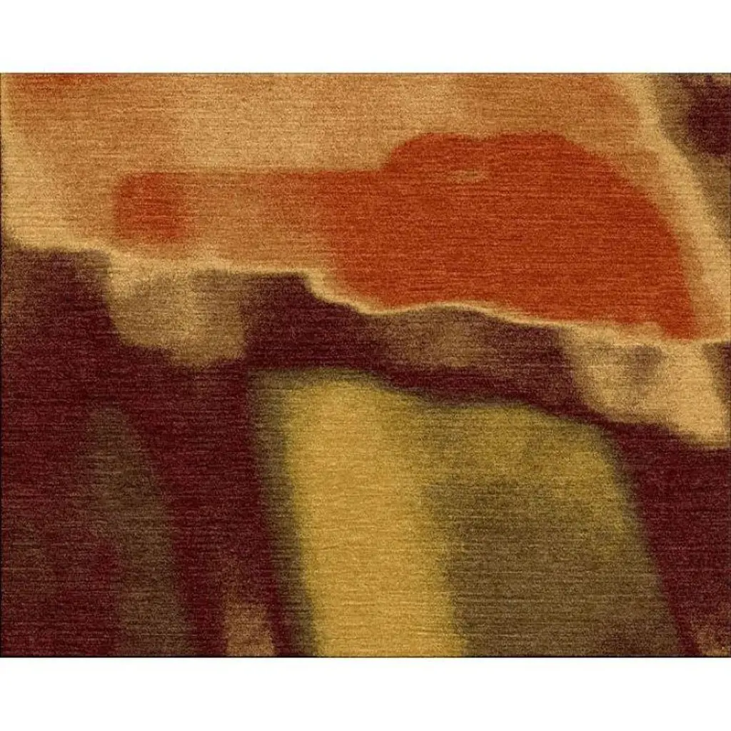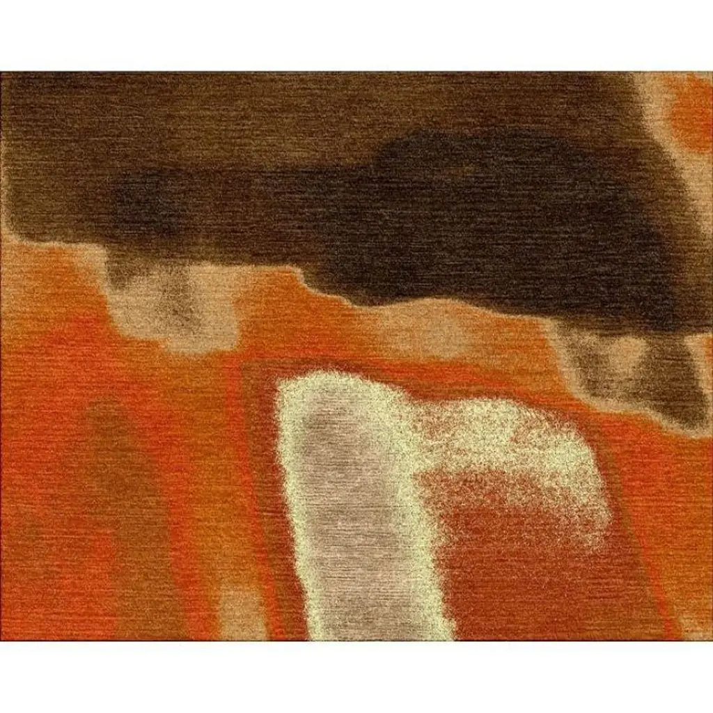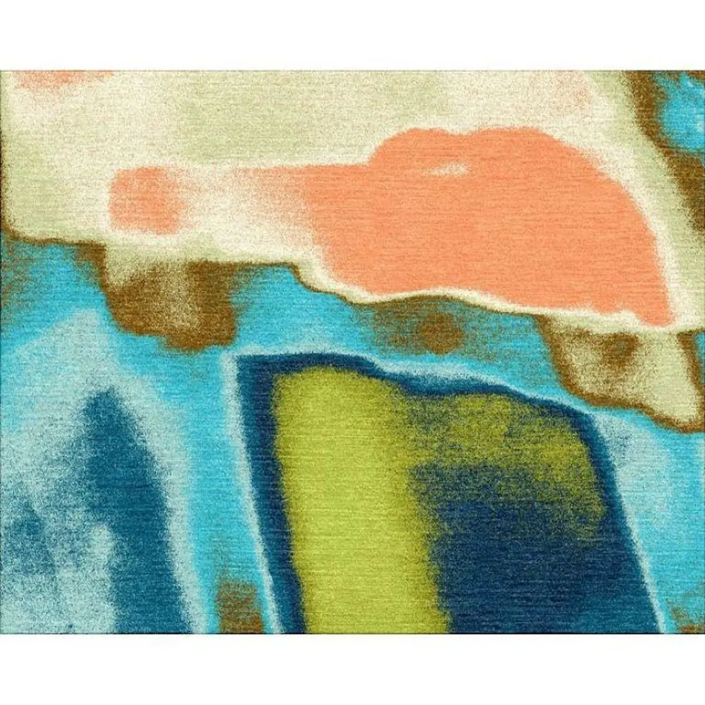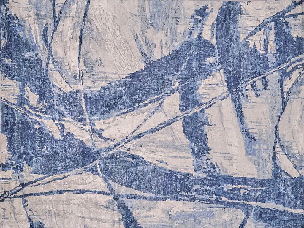 Eric Hildebrandt took a photograph of someone taking a SELFIE – if you look at it as orientated here you can see an iPhone in their hand. First, the original shot was out of focus, then Hildebrandt added digital blurring and other manipulations, then worked with the yarns to develop the final design and color palettes.Hand-knotted in Nepal.