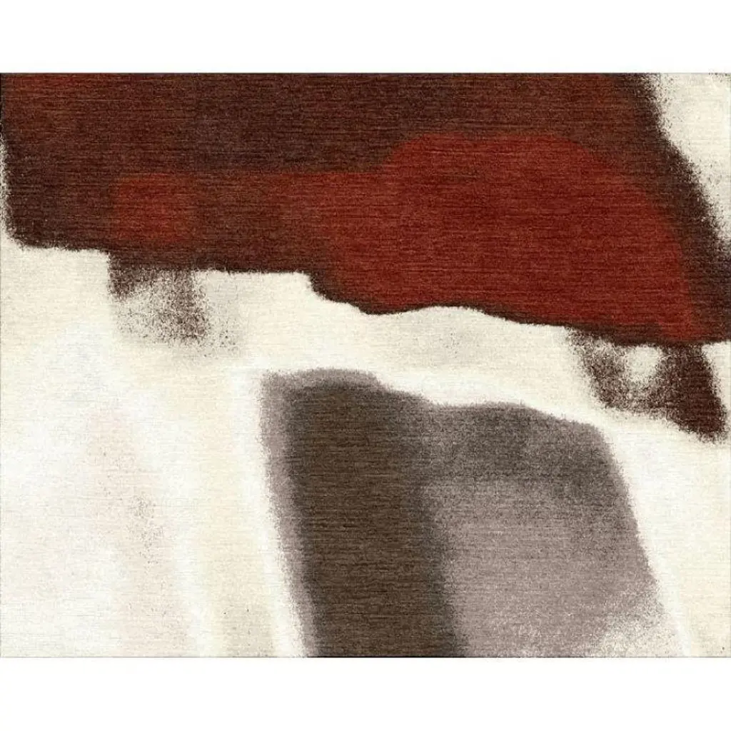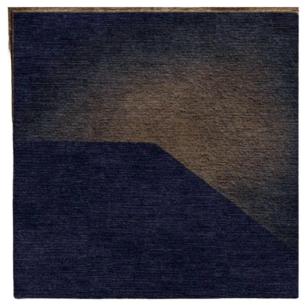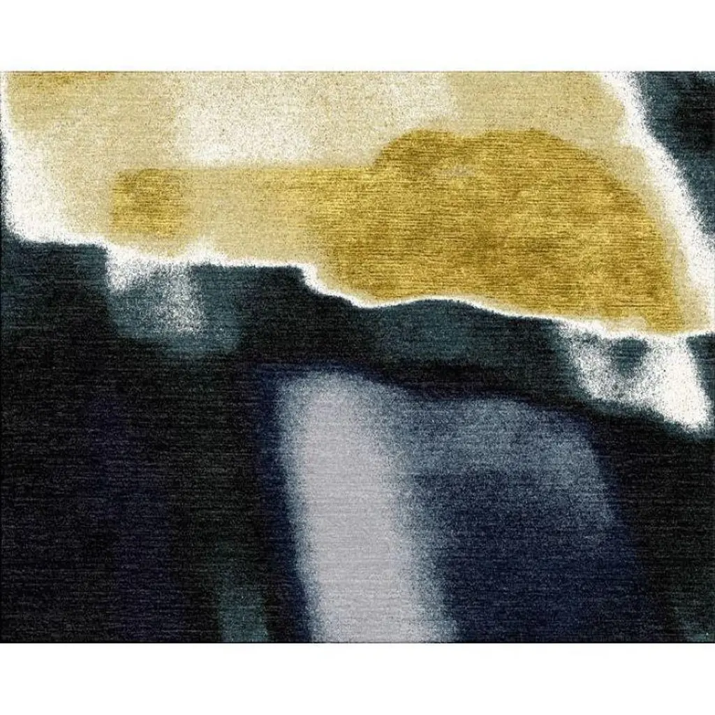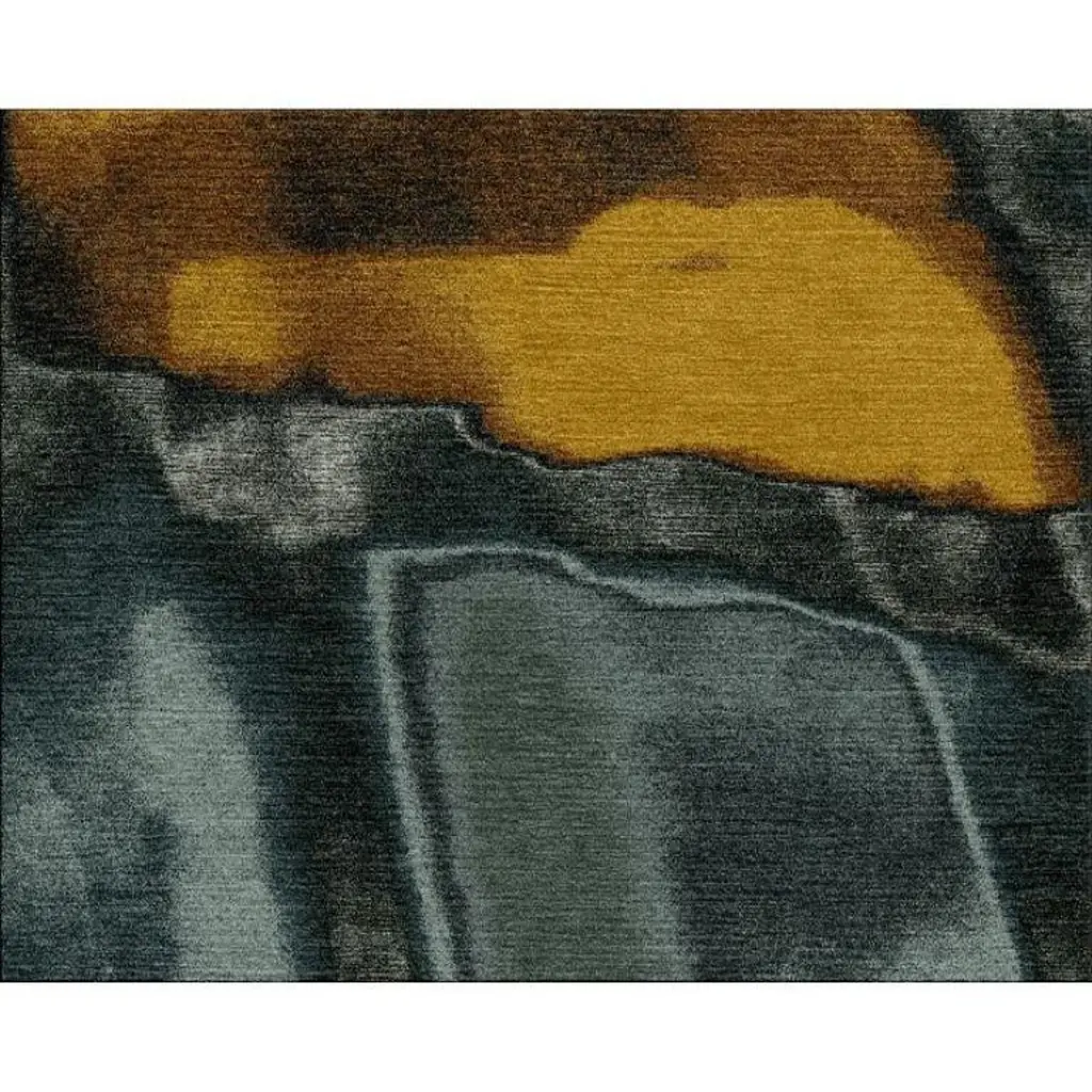 Eric Hildebrandt took a photograph of someone taking a SELFIE – if you look at it as orientated here you can see an iPhone in their hand. First, the original shot was out of focus, then Hildebrandt added digital blurring and other manipulations, then worked with the yarns to develop the final design and color palettes.Hand-knotted in Nepal.