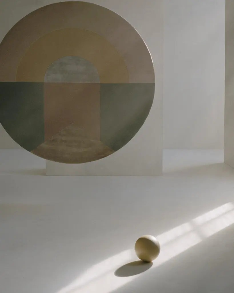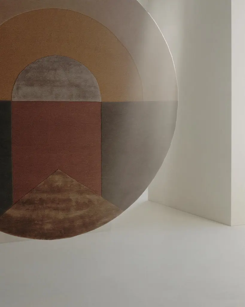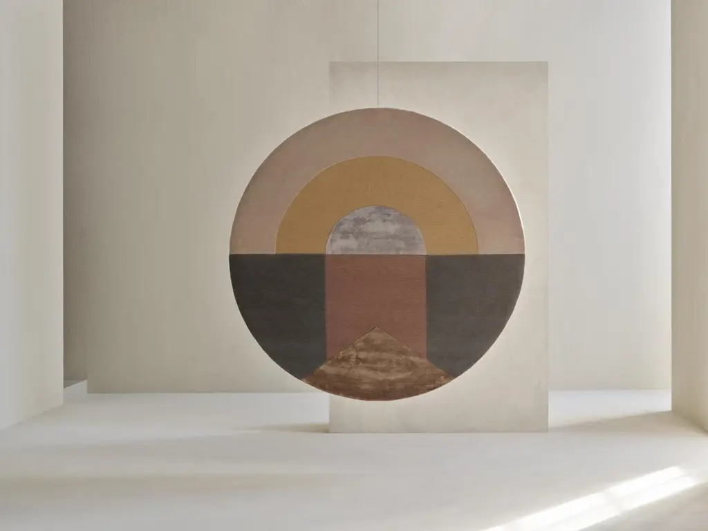 Seraphic Sun, 'Dimensuous' collection, by Linie DesignCircular handmade rug. Wool and silk, hand knotted.Two sizes available: 200cm or 250cmAn artistic and visually alluring hand-knotted rug from Linie Design. Eternal Orb uses contrasting colours and shapes to create an intricate design replicated in thousands of tiny knots. Using only natural, sustainable fibres, the rug is crafted in a luxurious blend of RWS wool and silk with an organic cotton warp, which enhances the colours, texture and sheen, while ensuring natural warmth, strength and durability. Hand-knotted by Linie Design’s artisan weavers, designed by Urd Moll Gundermann.