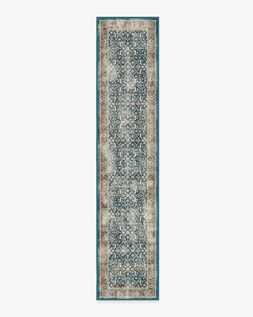 Inspired by Persian designs, this charming style features hand-drawn floral motifs that echo Mrs. Alice’s signature aesthetic. Soft and saturated shades of blues and greens blend seamlessly with warm beige tones, creating a harmonious palette that is both rich and inviting. Water-resistant, stain-resistant, and machine-washable. Rug colors may vary slightly according to your device and the lighting in your space.