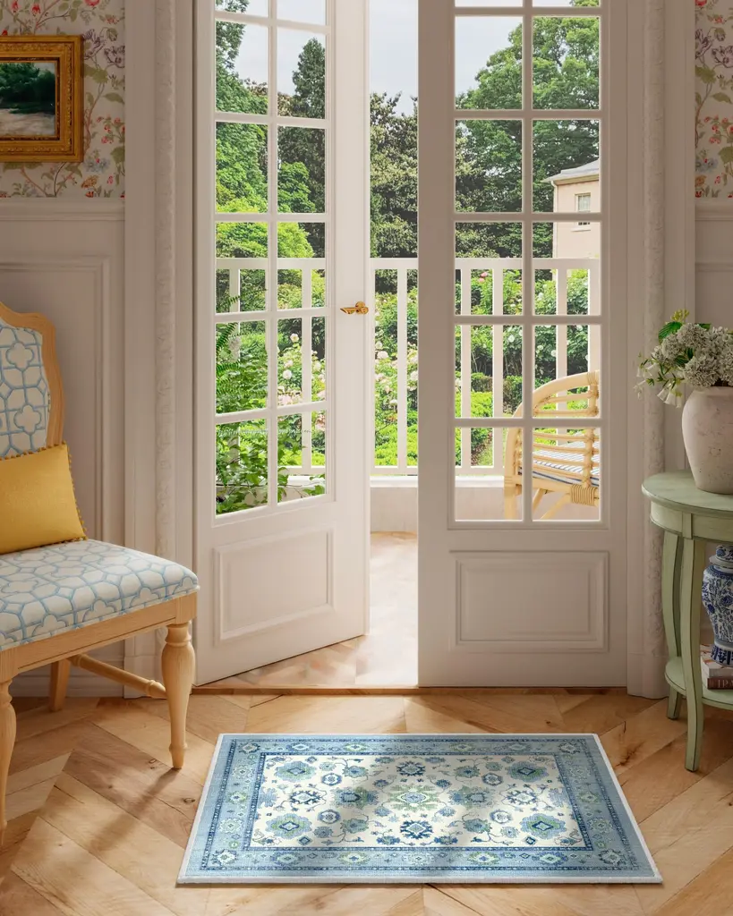 Inspired by Persian designs, this charming style features hand-drawn floral motifs that echo Mrs. Alice’s signature aesthetic. Soft and saturated shades of blues and greens blend seamlessly with warm beige tones, creating a harmonious palette that is both rich and inviting. Water-resistant, stain-resistant, and machine-washable. Rug colors may vary slightly according to your device and the lighting in your space.
