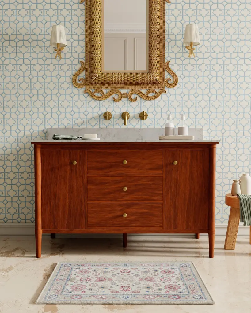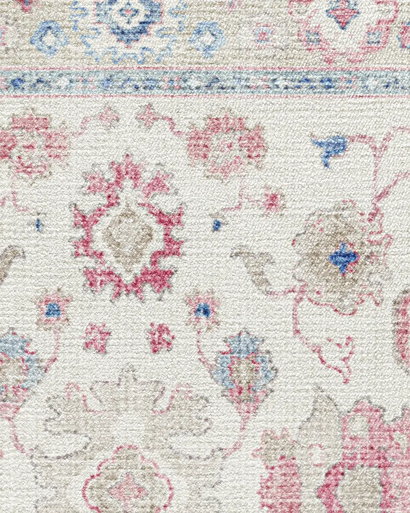 Drawing inspiration from Persian designs, this style showcases floral motifs that reflect Mrs. Alice’s signature hand-drawn prints. Soft, saturated shades of pinks and blues complement a warm beige background, creating a timeless palette that balances vintage charm with modern appeal. Water-resistant, stain-resistant, and machine-washable. Rug colors may vary slightly according to your device and the lighting in your space.