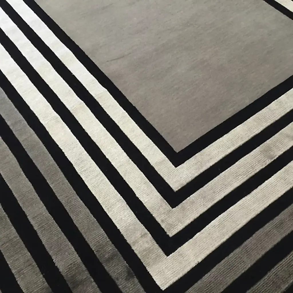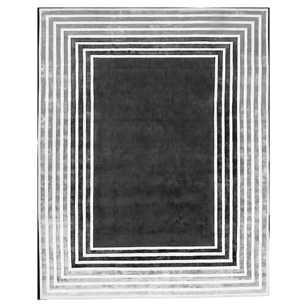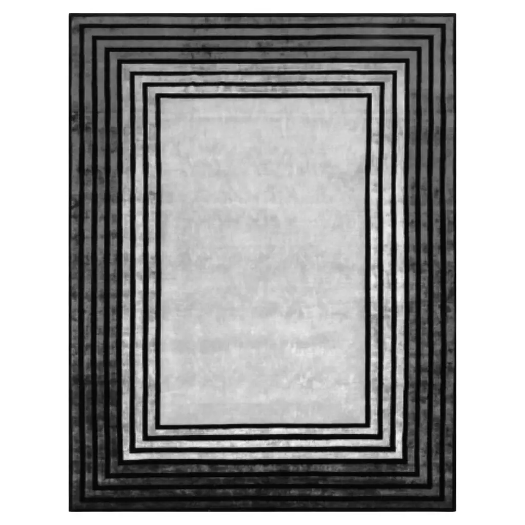 The Seven Area Rug from Illulian provides a delightful modern presence to indoor surroundings. An intricate contemporary construction that contrasts a color gradient with concentric rectangular patterns, its band patterns ripple out from a central block at the heart of the rug, its robust form artfully hand-knotted by Nepalese artisans from a wool-silk blend.