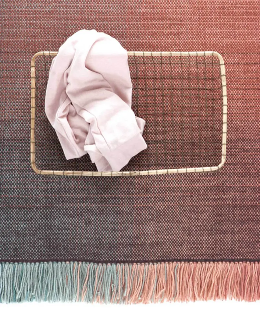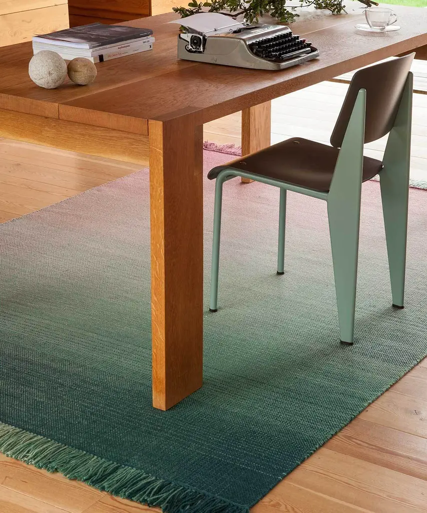 A hand-loomed rug made from ombr_ yarns that are carefully woven to create an immensely saturated gradient pattern. The Shade collection is inspired by magical moments in nature where colors melt and speak for themselves. Designer Begum Cana emphasizes: "this is a handmade flat-weave rug that generates an incredible and well-rounded diffusion of color. The surface releases a sense of tranquillity and well-being that is balanced by the penetrating vibration of colors."This collection of exquisite simplicity reflects a complex technical process to achieve the density, regularity, and fluidity of the desired effect. Two gradients converge in each rug, one vertical and one horizontal, in the same plane, harmonically using six transitional shades.The rug is available in three ombr_ palettes: from turquoise to eggplant, russet to Klein blue, and raspberry to forest green.Produced by award-winning Spanish rug manufacturer nanimarquina.