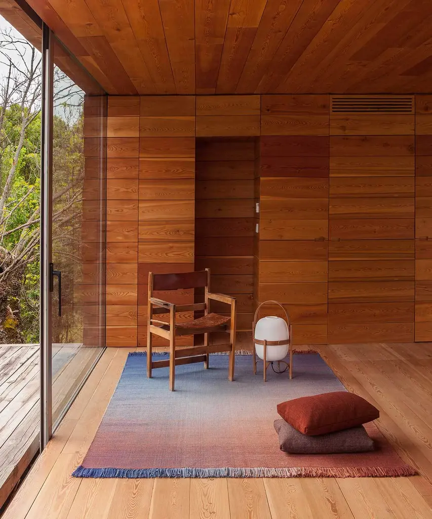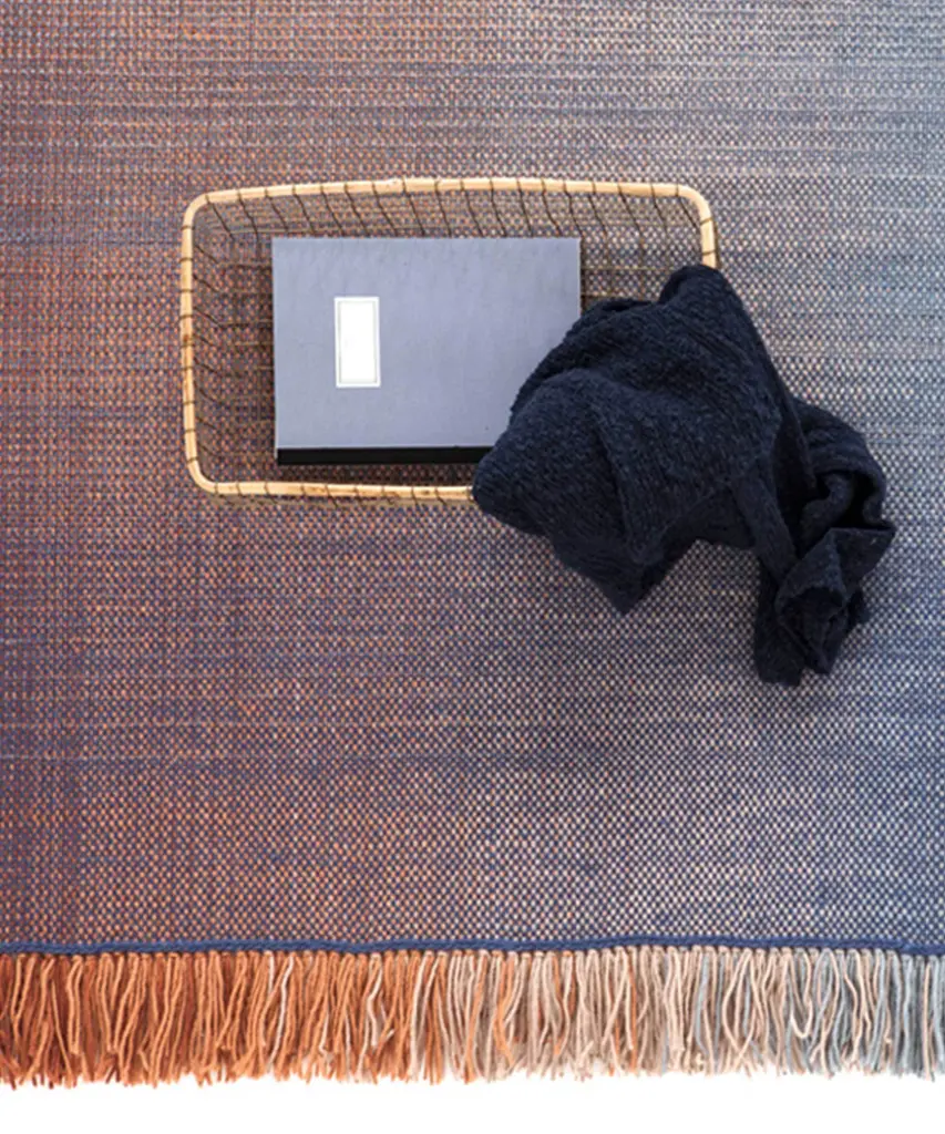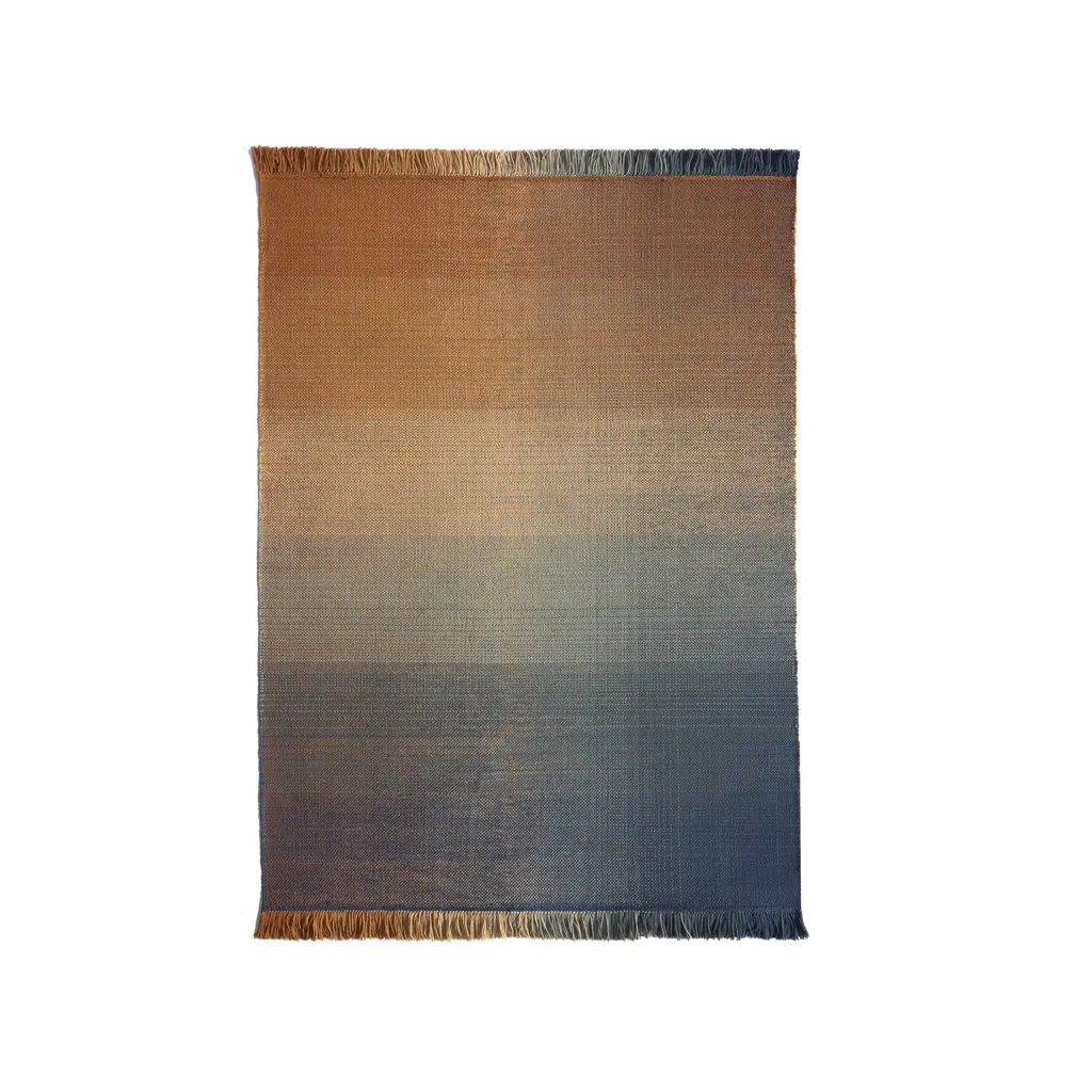 A hand-loomed rug made from ombr_ yarns that are carefully woven to create an immensely saturated gradient pattern. The Shade collection is inspired by magical moments in nature where colors melt and speak for themselves. Designer Begum Cana emphasizes: "this is a handmade flat-weave rug that generates an incredible and well-rounded diffusion of color. The surface releases a sense of tranquillity and well-being that is balanced by the penetrating vibration of colors."This collection of exquisite simplicity reflects a complex technical process to achieve the density, regularity, and fluidity of the desired effect. Two gradients converge in each rug, one vertical and one horizontal, in the same plane, harmonically using six transitional shades.The rug is available in three ombr_ palettes: from turquoise to eggplant, russet to Klein blue, and raspberry to forest green.Produced by award-winning Spanish rug manufacturer nanimarquina.