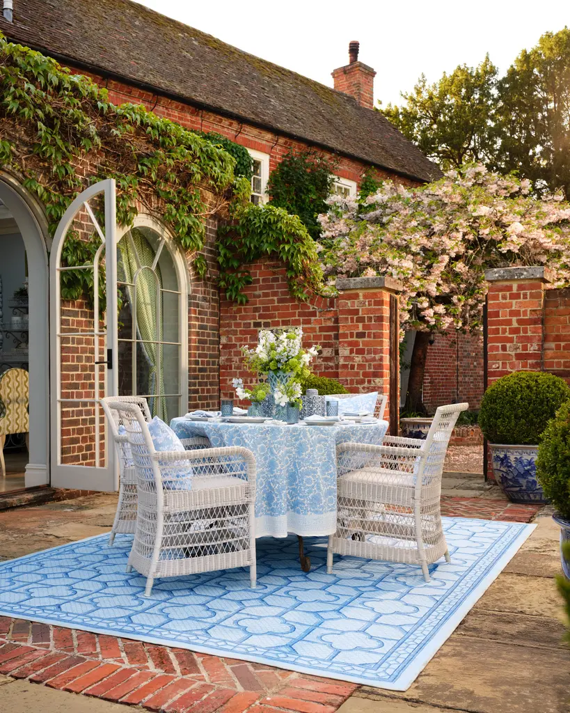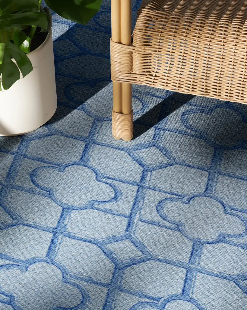 Drawing directly from Mrs. Alice's patterned bamboo designs, this rug showcases a hand-drawn-like blue bamboo graphic that offers a calming, natural vibe. The mingling of varying medium and light blue hues as a backdrop evokes a sense of tranquility, perfect for creating an inviting outdoor retreat. The extra-durable, machine-washable material is perfect for both outdoor and indoor use, especially high-traffic areas and those exposed to the elements. Rug colors may vary slightly according to your device and the lighting in your space.
