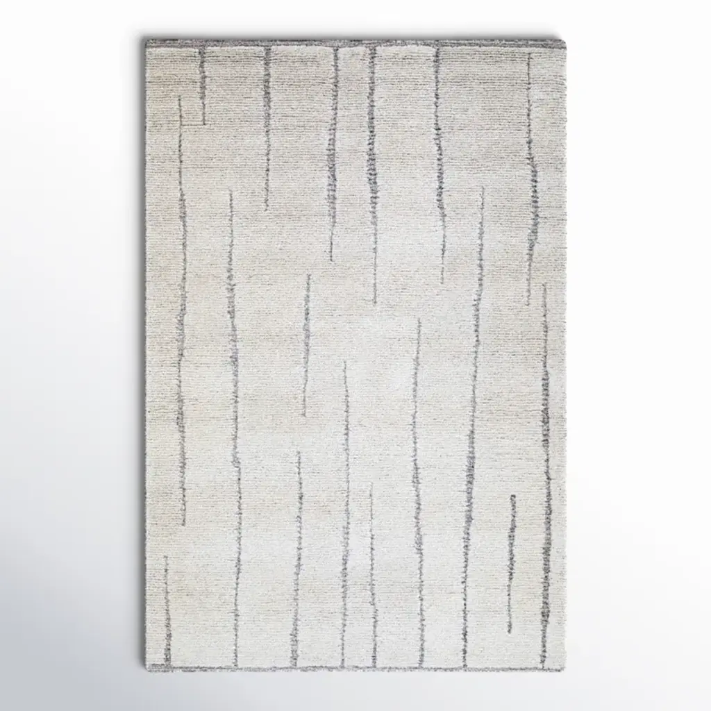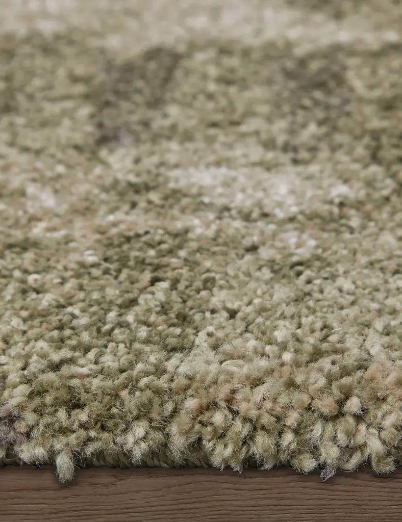 Layer plush texture underfoot with the Sheridan rug. The abstract design offers a dynamic look grounded in a lush tan-on-green colorway, perfect for modern decor. With its thick pile and tranquil tone, this rug sets a soft foundation for quiet comfort in a bedroom or lounge.