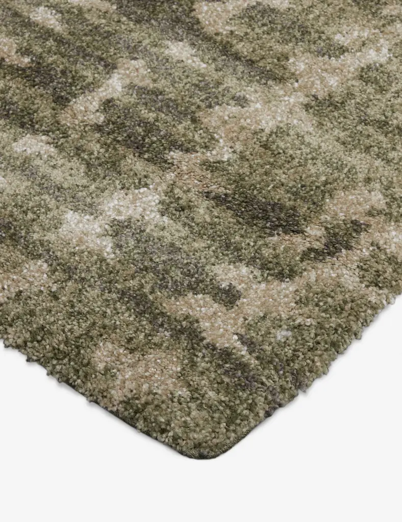 Layer plush texture underfoot with the Sheridan rug. The abstract design offers a dynamic look grounded in a lush tan-on-green colorway, perfect for modern decor. With its thick pile and tranquil tone, this rug sets a soft foundation for quiet comfort in a bedroom or lounge.