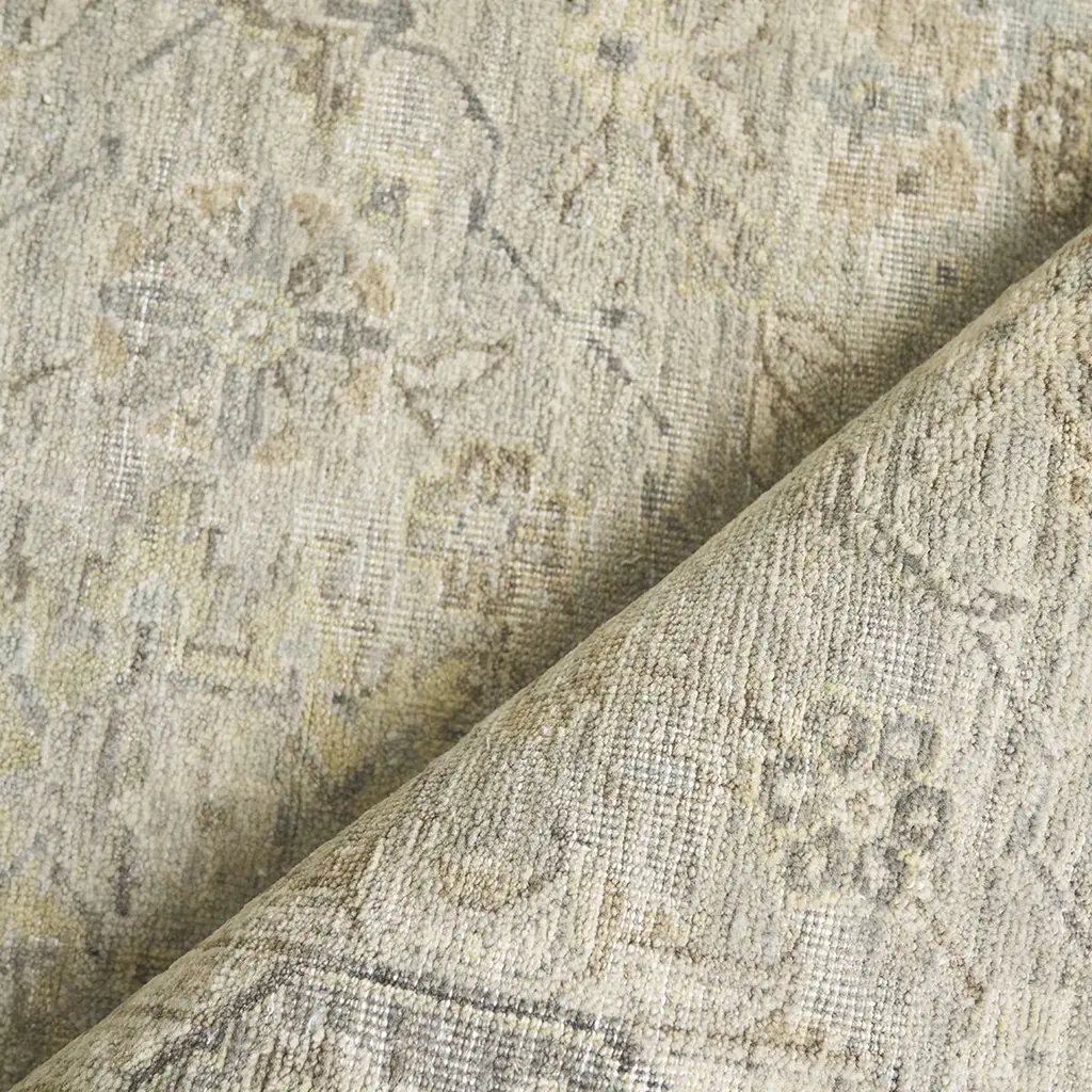 The Shine Collection is hand-knotted from 100% wool. Each piece undergoes random hand shearing and special washing processes, resulting in a unique distressed finish. These rugs evoke the feel of time-worn vintage pieces and the look of antiques, with sun-washed reproductions ensuring no two rugs are the same.