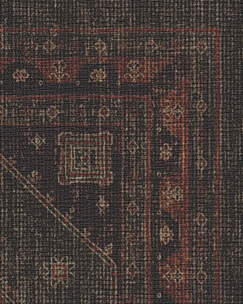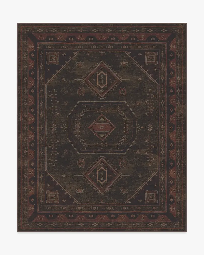 Welcome life home with our Shira Bordeaux Rug. Full of imaginative motifs inspired by artisanal Spanish creators, this worldly, geometric design uses a dark, neutral brown background as the canvas for rich accents such as burgundy and saturated brown. The neutral linework complements delicate sunspots, giving an aged feel that offers a worn, welcoming aesthetic. Water-resistant, stain-resistant, and machine-washable. Rug colors may vary slightly according to your device and the lighting in your space.