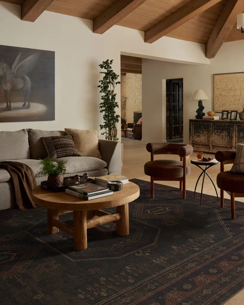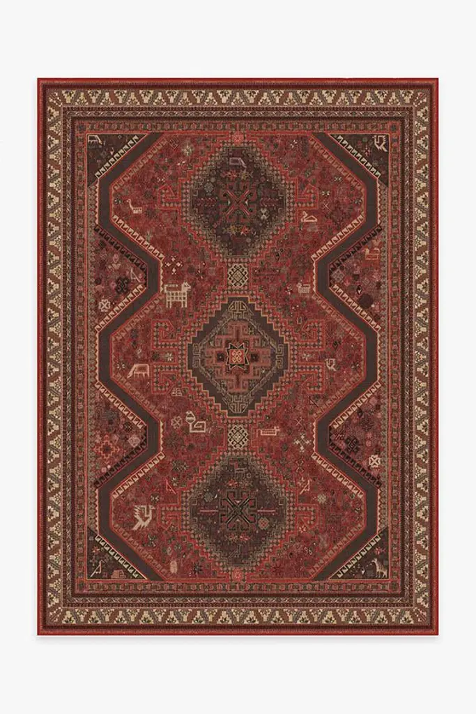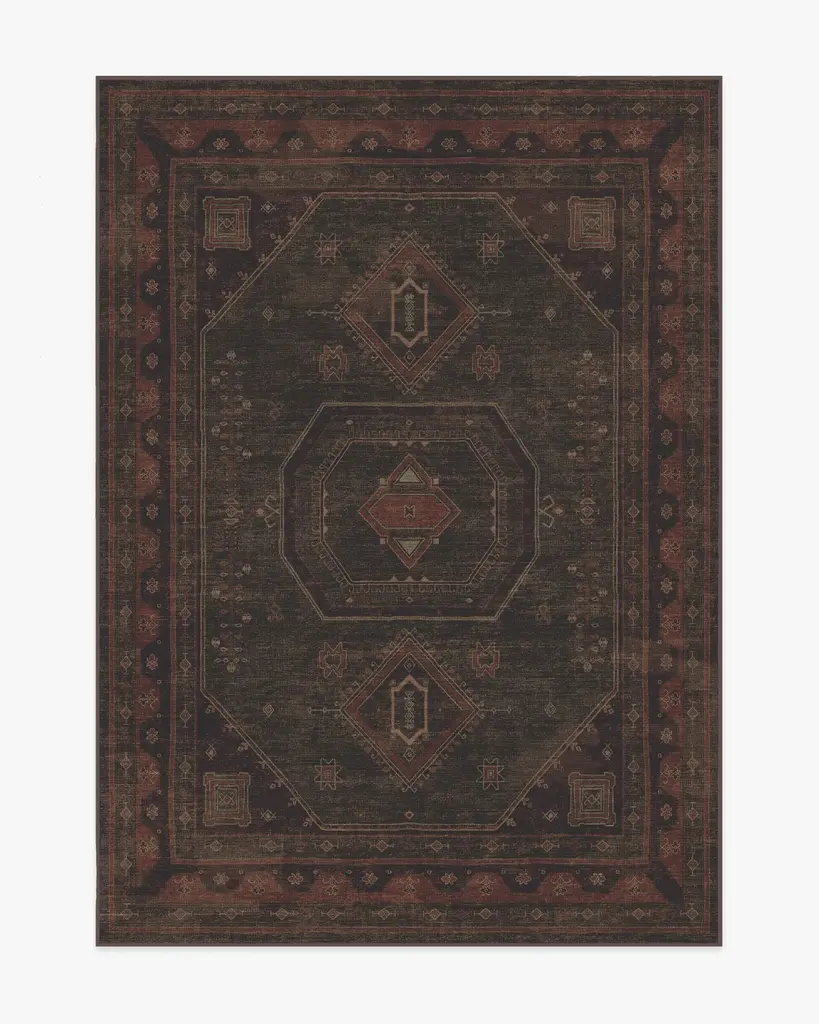 Welcome life home with our Shira Bordeaux Rug. Full of imaginative motifs inspired by artisanal Spanish creators, this worldly, geometric design uses a dark, neutral brown background as the canvas for rich accents such as burgundy and saturated brown. The neutral linework complements delicate sunspots, giving an aged feel that offers a worn, welcoming aesthetic. Water-resistant, stain-resistant, and machine-washable. Rug colors may vary slightly according to your device and the lighting in your space.