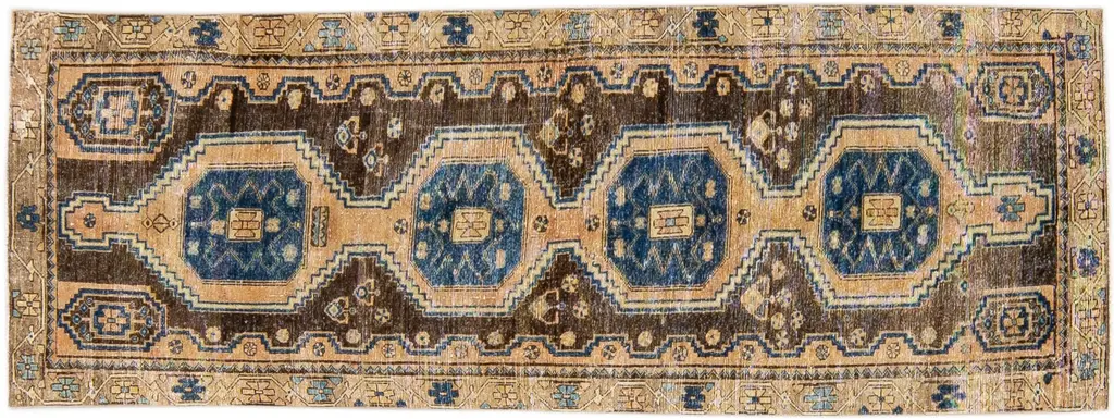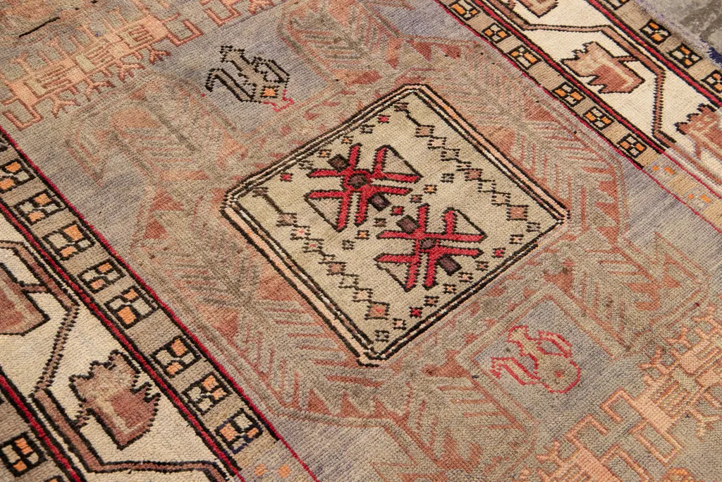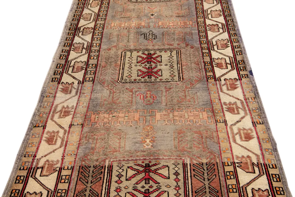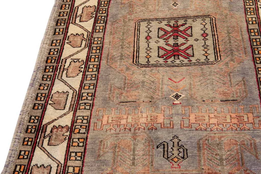 Beautiful Antique Persian Shiraz Handmade Wool rug with an all-over peach field. This piece has multicolor accents in a gorgeous all-over geometric design. This rug measures: 4' x 10'7".