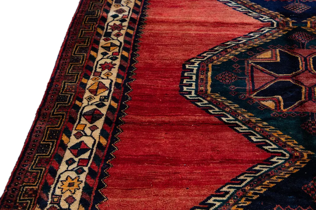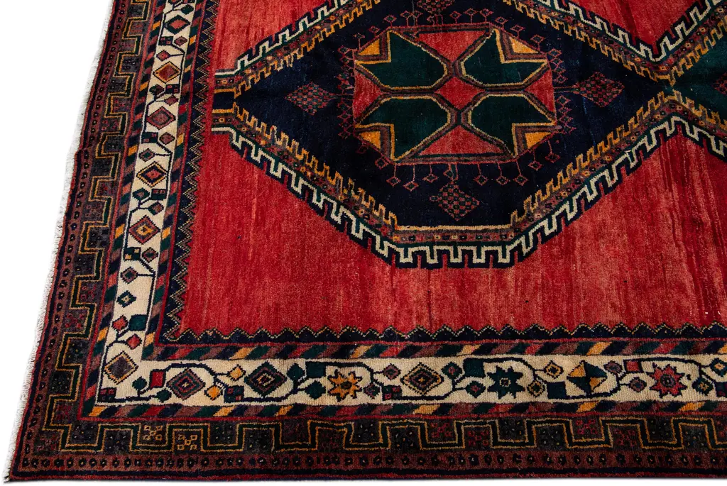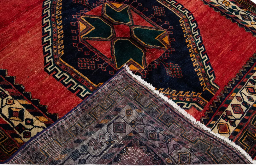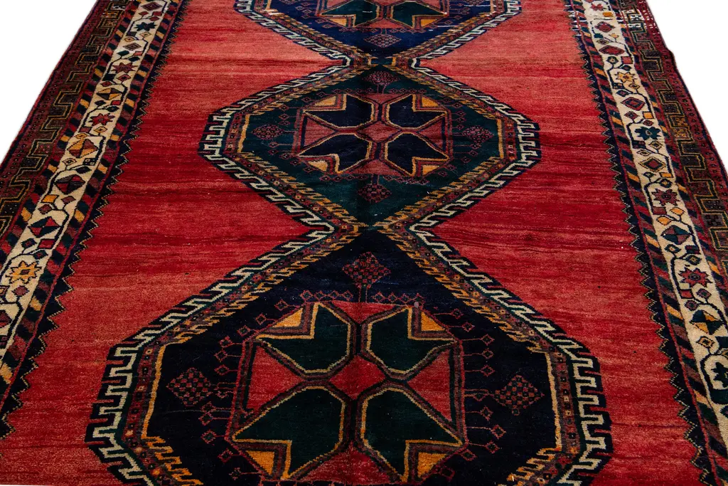 Beautiful Vintage Shiraz hand-knotted Wool rug with the red field. This Shiraz rug has multicolor accents in all over multi-medallion design. This rug measures: 5'11" X 10'11"