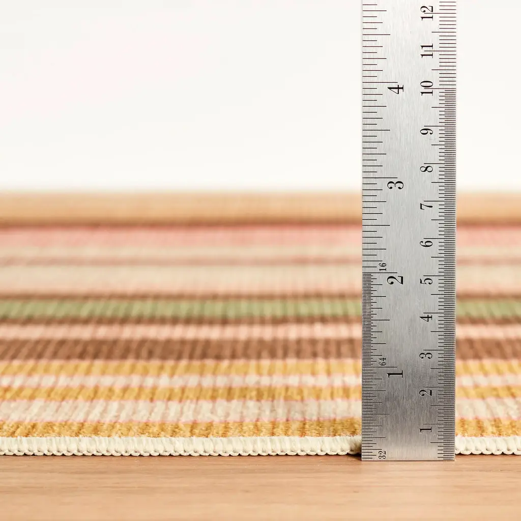 Part of our best-in-class collection of design-focused, machine-washable rugs. With its sunny style and vivid vertical stripes, this superior-quality, machine-washable rug layers warmth, color, and easy-to-clean convenience into any space. Ideally suited for high-traffic areas like playrooms, kitchens, and entryways, it lies flat and remains soft underfoot with no shedding or fuzzing, even after multiple washes.