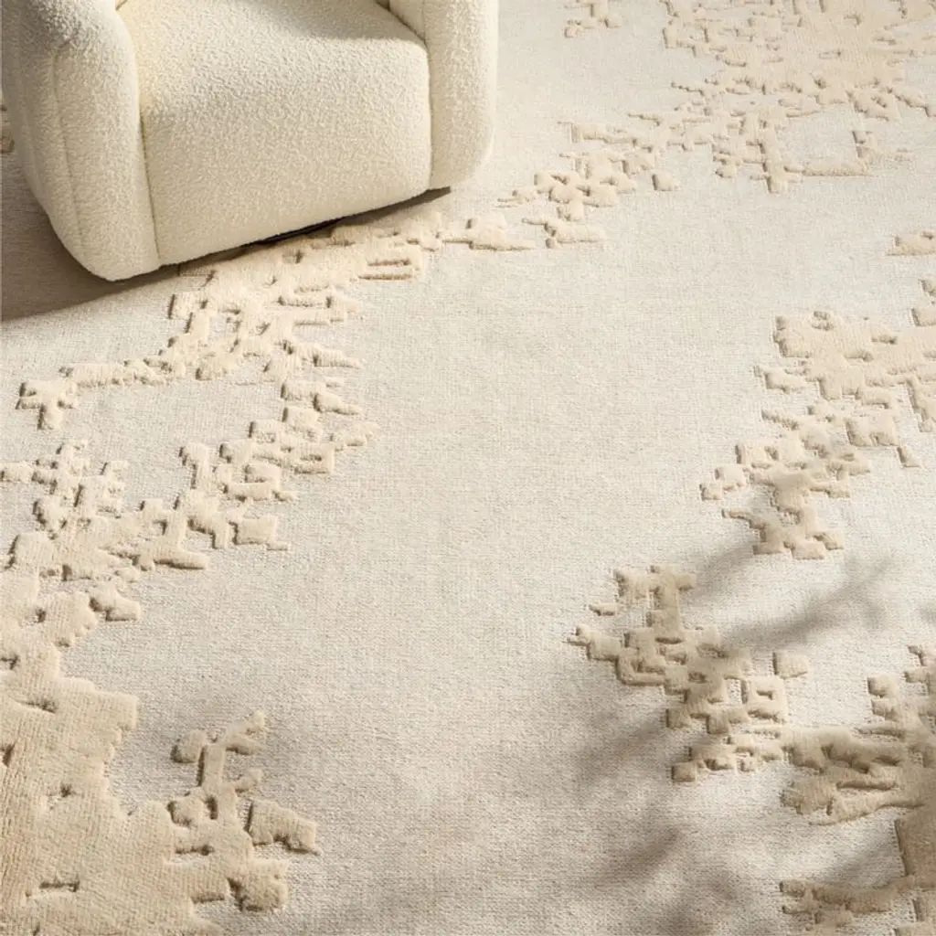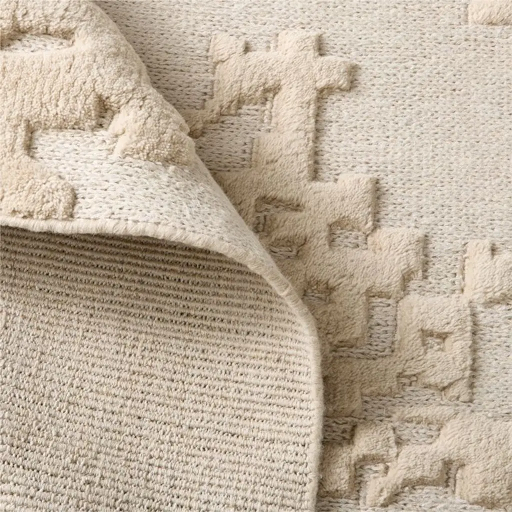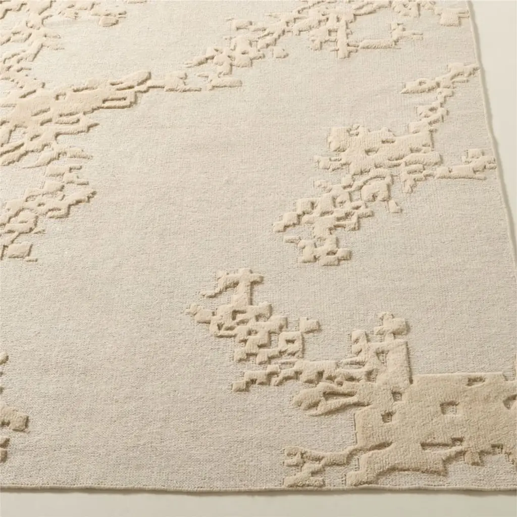 Designed by Kara Mann, area rug translates the delicate patterns of lace into a refined, textural design. Densely hand-knotted using the soumak techniquea method that wraps yarn around the warp threads to create a braided, raised effectit features a 100% linen base and a luxurious blend of New Zealand and European wool for a soft pile well-suited to medium-traffic areas. CB2 exclusive.How will it look in your room? 12"x12" rug samples are available in stores for a fee refundable upon return of the sample.