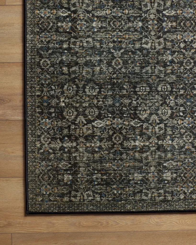 Add weight to any space with the Soft Black Rug that is as easy on your feet as it is on the eyes. This rug celebrates a simple, worn look inspired by traditional vintage Persian patterns and motifs with pops of ochre gold and dusty indigo for a visual surprise. Water-resistant, stain-resistant, and machine-washable. Colors may vary by device and lighting.